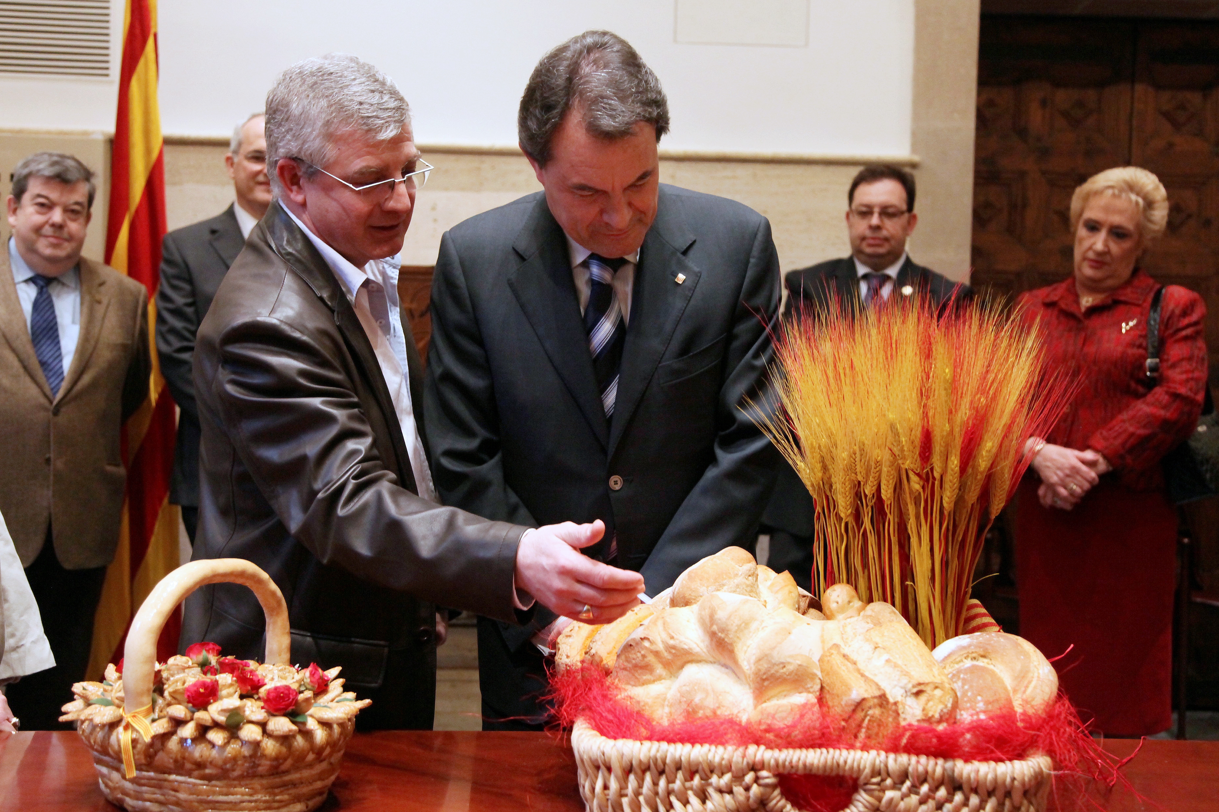 Seguidament, ha estat el torn de la Federació Catalana d’Associacions de Gremis de Flequers, que també han preparat una creació especial per a l’ocasió. L’obsequi ha estat una cistella feta amb pa plena de barretes en forma de ram de flors, i una panera amb una petita mostra de la gran varietat de pans que s’elaboren arreu del territori català, entre ells, el pa que es fa especialment pel dia de Sant Jordi.