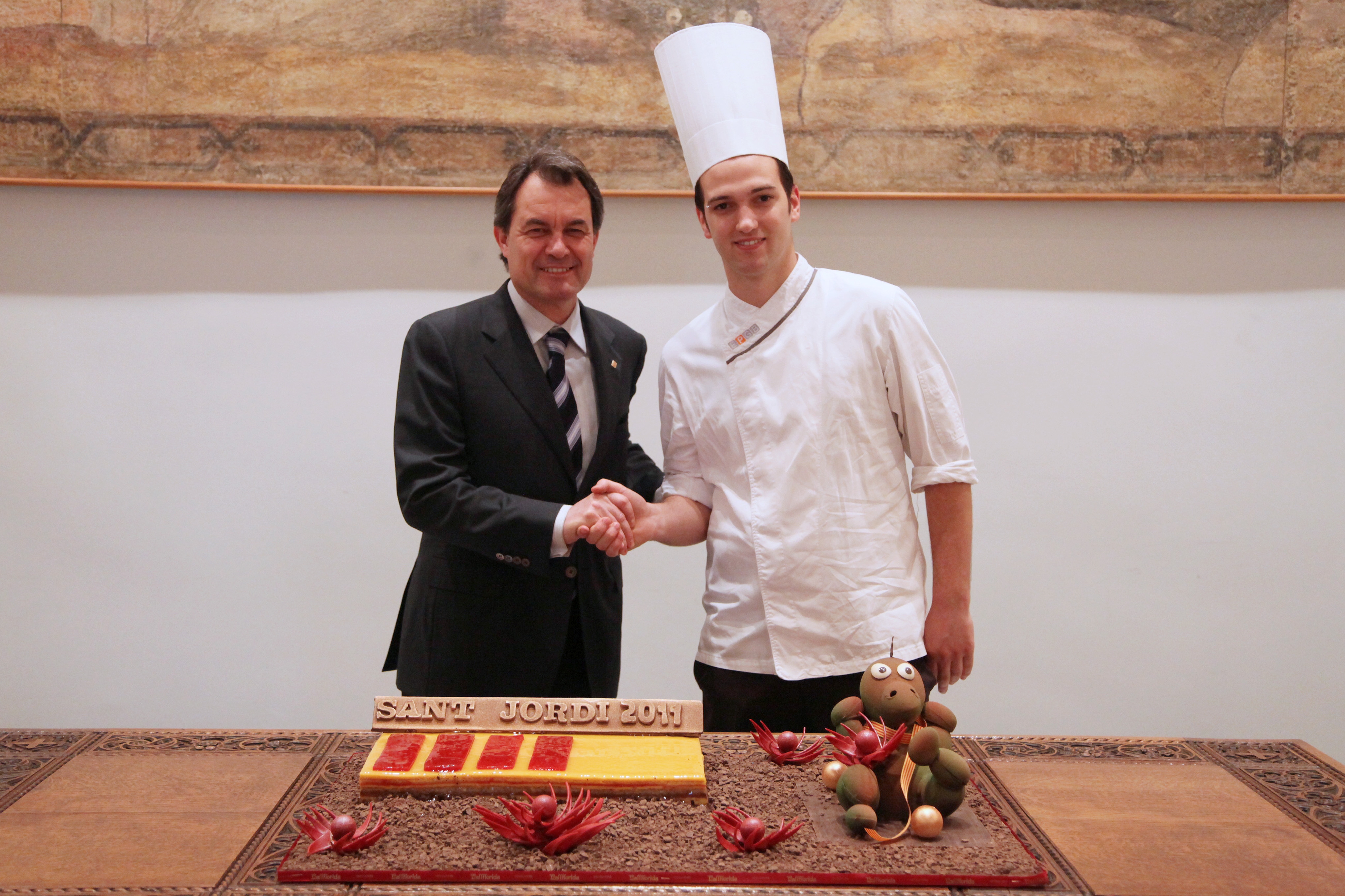 El president ha rebut en primer lloc una delegació del Gremi de Pastisseria de Barcelona i Província, encapçalada pel seu president, Joan Turull. En aquesta ocasió, el gremi ha ofert al cap de l’Executiu un pastís elaborat per Lluís Costa, de la pastisseria Vallflorida, de Sant Esteve de Palautordera. El dolç estava elaborat sobre una base de pa de pessic d’avellanes de Reus i xocolata negra i format per una peça rectangular de cremós d’albercoc amb fruita de la passió, simbolitzant les quatre barres, i una figura de xocolata en forma de drac, en homenatge a la llegenda de Sant Jordi.