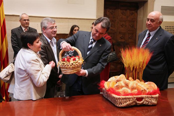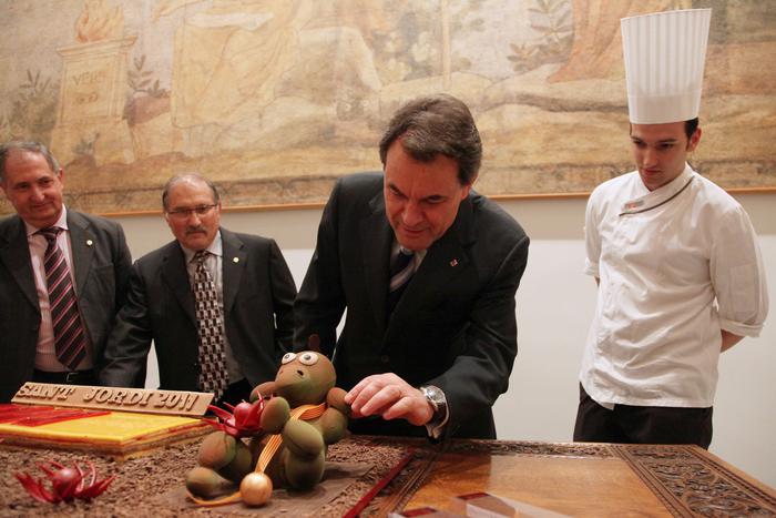 El president de la Generalitat, Artur Mas, ha rebut aquesta tarda al Palau de la Generalitat a representants dels gremis de Flequers i Pastissers, amb motiu de la celebració, el proper dissabte dia 23, de la Diada de Sant Jordi. Cada any, els dos gremis ofereixen com a obsequi a la Generalitat una creació única elaborada per professionals del sector i vinculada amb la festivitat del patró de Catalunya.