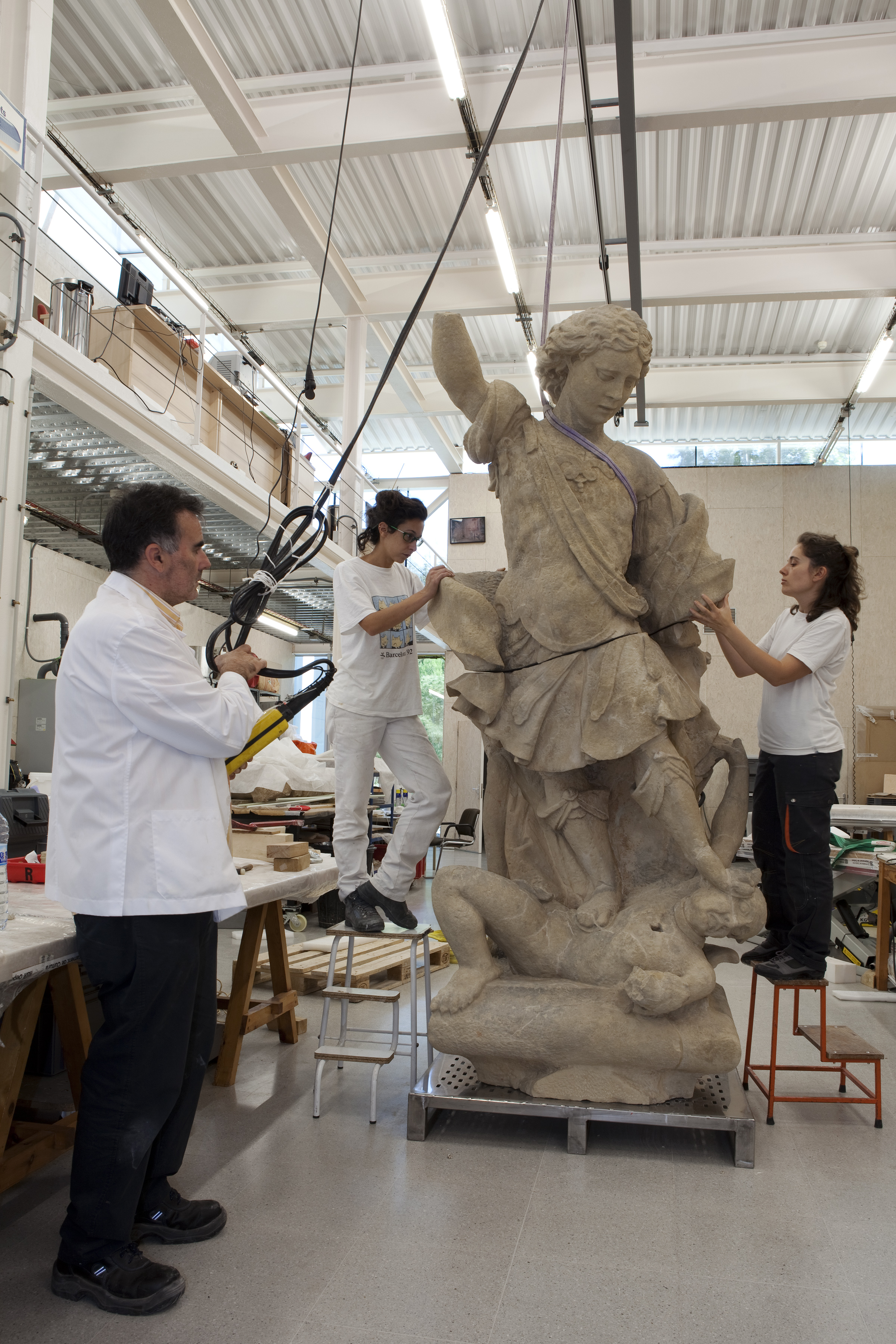 El procés de restauració de l’escultura de Sant Miquel Arcàngel ha estat d’una gran complexitat tècnica, a causa de les grans dimensions de l’escultura (3 metres d’alçada i 3 tonelades de pes), per la degradació produïda per agents biològics i del difícil procés de desmuntatge de la mateixa de la part superior de la teulada de l’església.