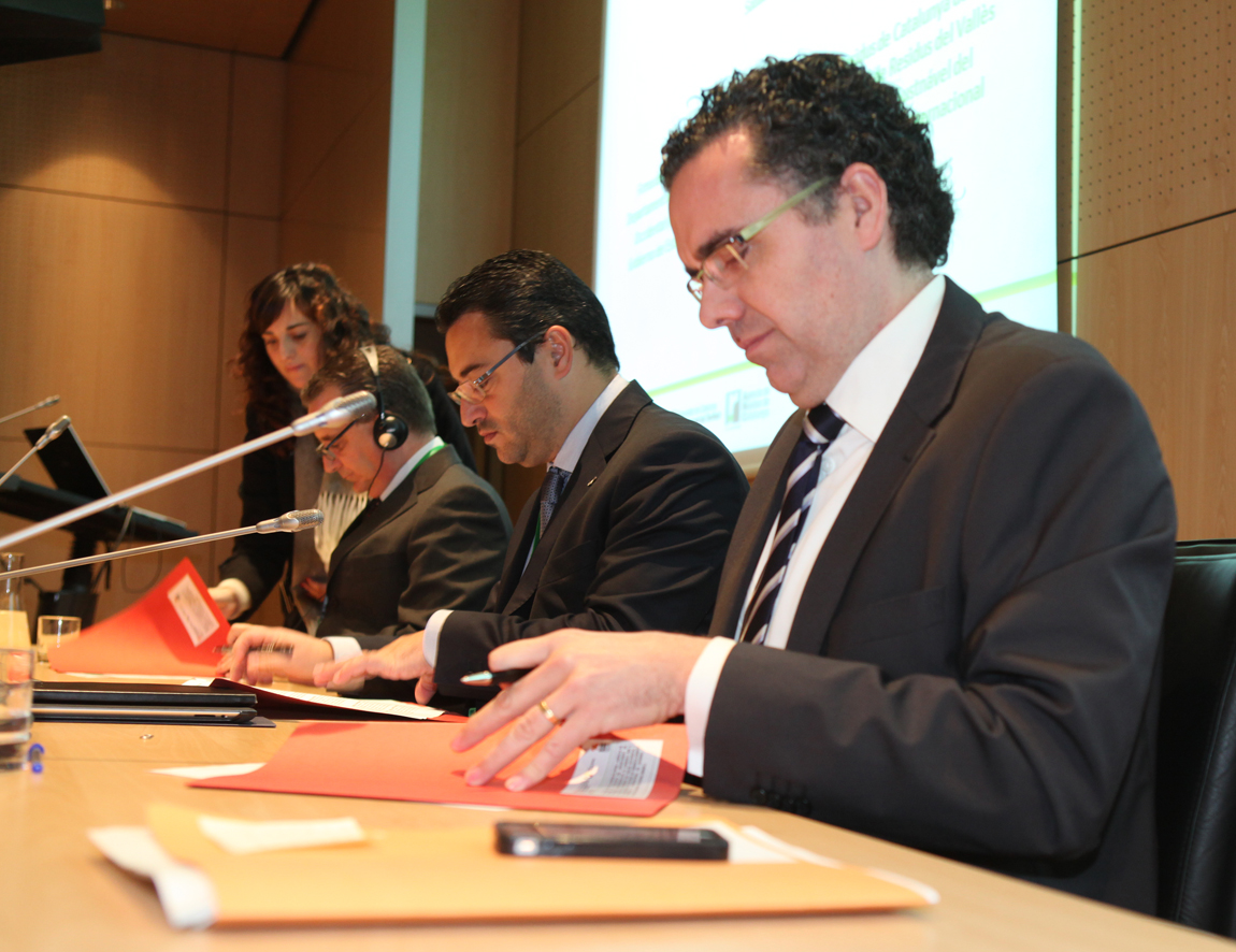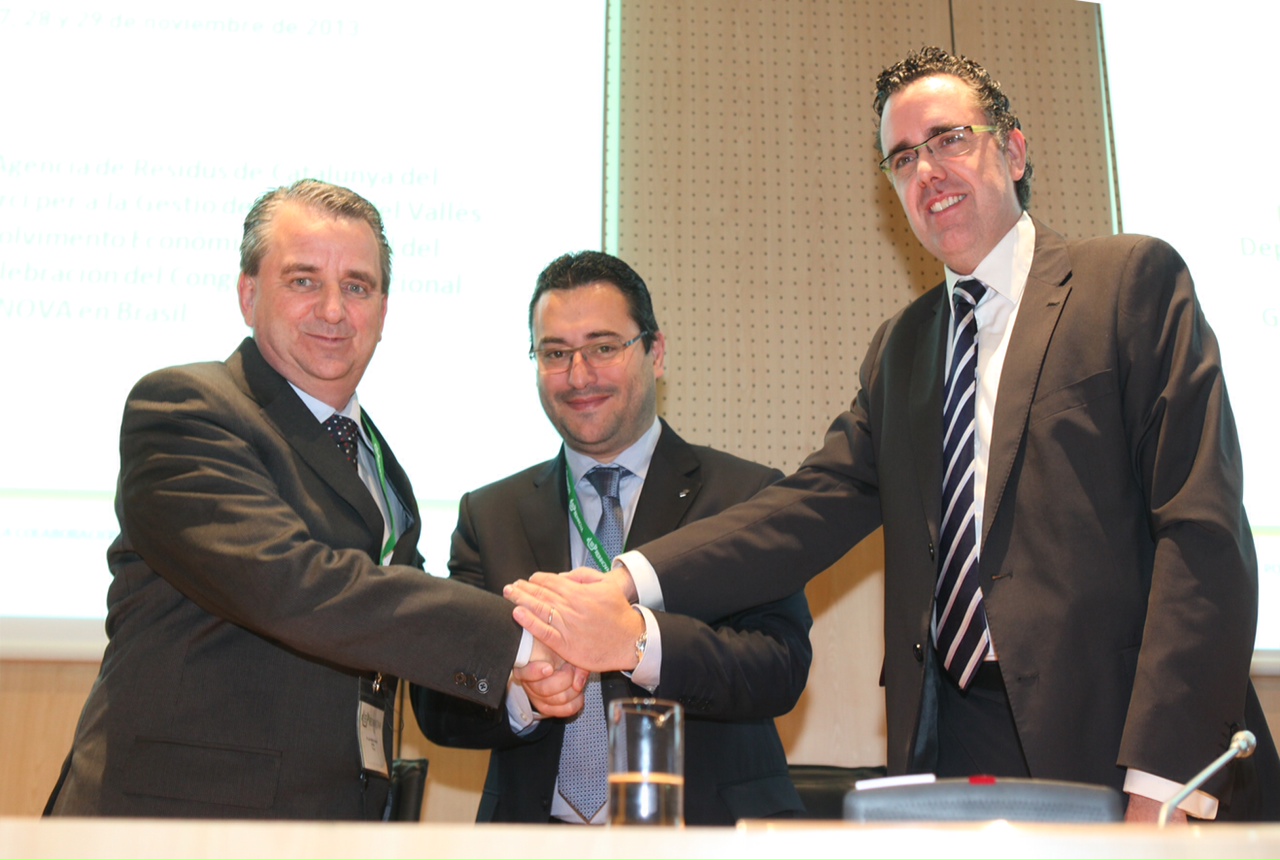 El director de l’Agència de Residus de Catalunya (ARC), Josep Maria Tost, el president del Consorci per a la Gestió de Residus del Vallès Occidental, Juan Carlos Sánchez, i el director de Sanejament i Medi Ambient de la Secretaria d’Estat de Desenvolupament Econòmic i Sostenible del Govern de l’Estat de Santa Catarina, al Brasil, Luiz Antonio Garcia, han signat aquest matí un conveni per a la realització del Congrés d’Innovació en la Gestió i Tractament dels Residus Municipals (REINNOVA) al Brasil. Precisament la signatura ha tingut lloc durant aquest congrés ,que s’està celebrant des de dimecres a la Fira de Sabadell.