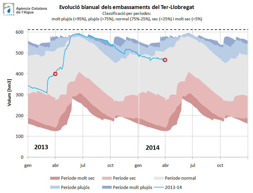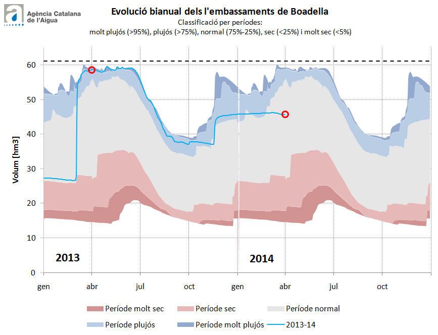 El sistema Ter-Llobregat se situa al 76% de la seva capacitat (468 hm3), 10 punts més que fa un any, quan emmagatzemava 403 hm3 (66%). L’embassament de Boadella, per la seva banda, se situa al 75% de la seva capacitat (46 hm3), 21 punts menys que fa un any, quan emmagatzemava 59 hm3. D’altra banda, els pantans de Foix, Siurana i Riudecanyes se situen al 100, 98 i 75%, respectivament, uns volums lleugerament inferiors als registrats fa un any.