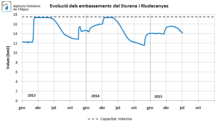Els embassaments de les conques internes se situen, a principis de juliol, al 85% de la seva capacitat, emmagatzemant un total de 590 hm3. Aquest volum és lleugerament superior al registrat durant les mateixes dates de l’any passat, quan les reserves embassades eren del 83% i 576 hm3, segons dades de l’Agència Catalana de l’Aigua. Amb el volum de reserves actual es garanteixen totes les demandes ordinàries per a un període d’uns 14 mesos.