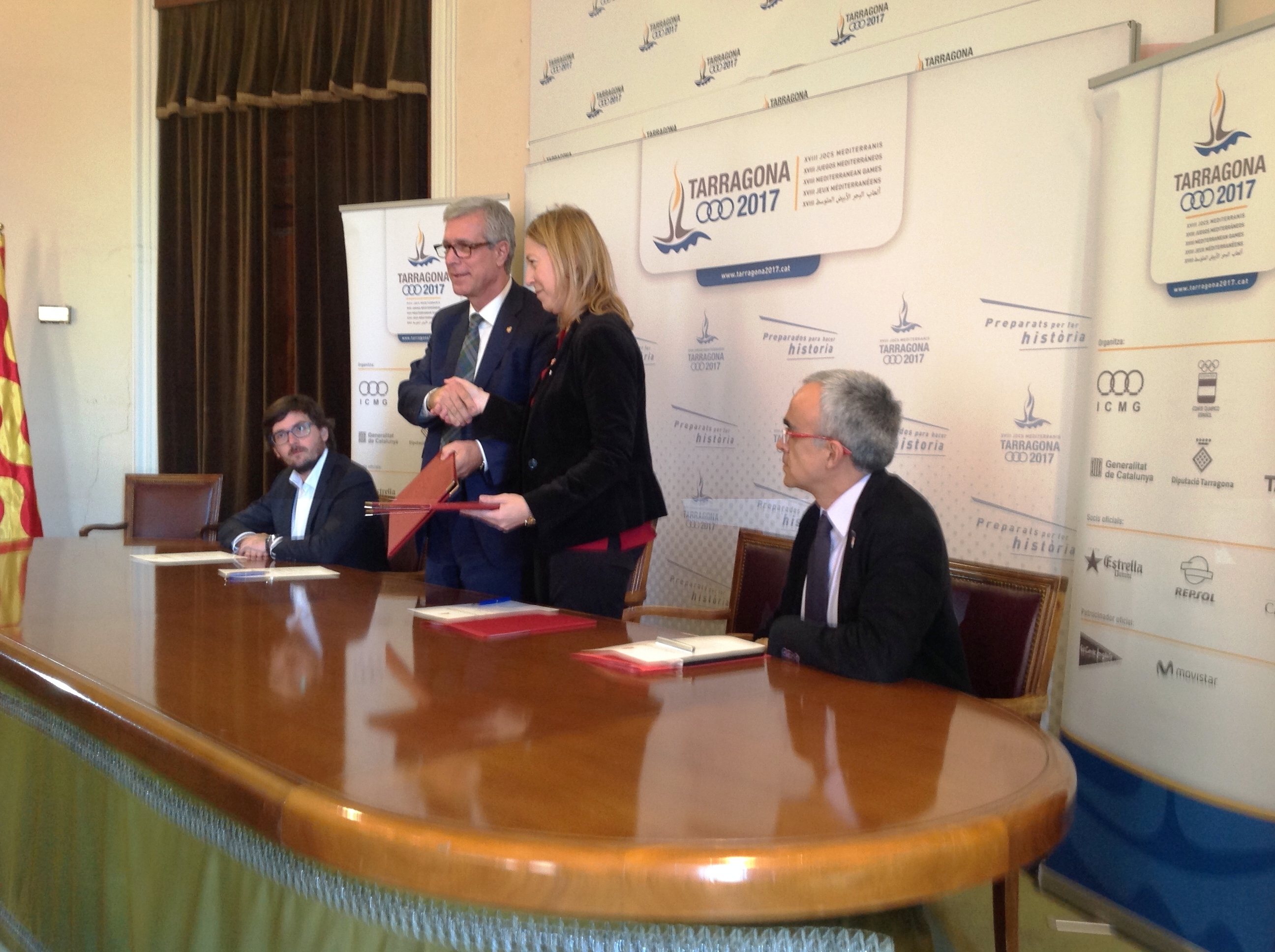 La vicepresidenta del Govern i consellera de Benestar Social i Família, Neus Munté, i l’alcalde de Tarragona i president de la Fundació Tarragona 2017, Josep Fèlix Ballesteros, han signat aquest migdia un conveni de col·laboració pel foment de l’associacionisme i el voluntariat en el marc dels Jocs Mediterranis Tarragona 2017. L’acte de signatura ha tingut lloc a la sala d’actes de l’Ajuntament de Tarragona..