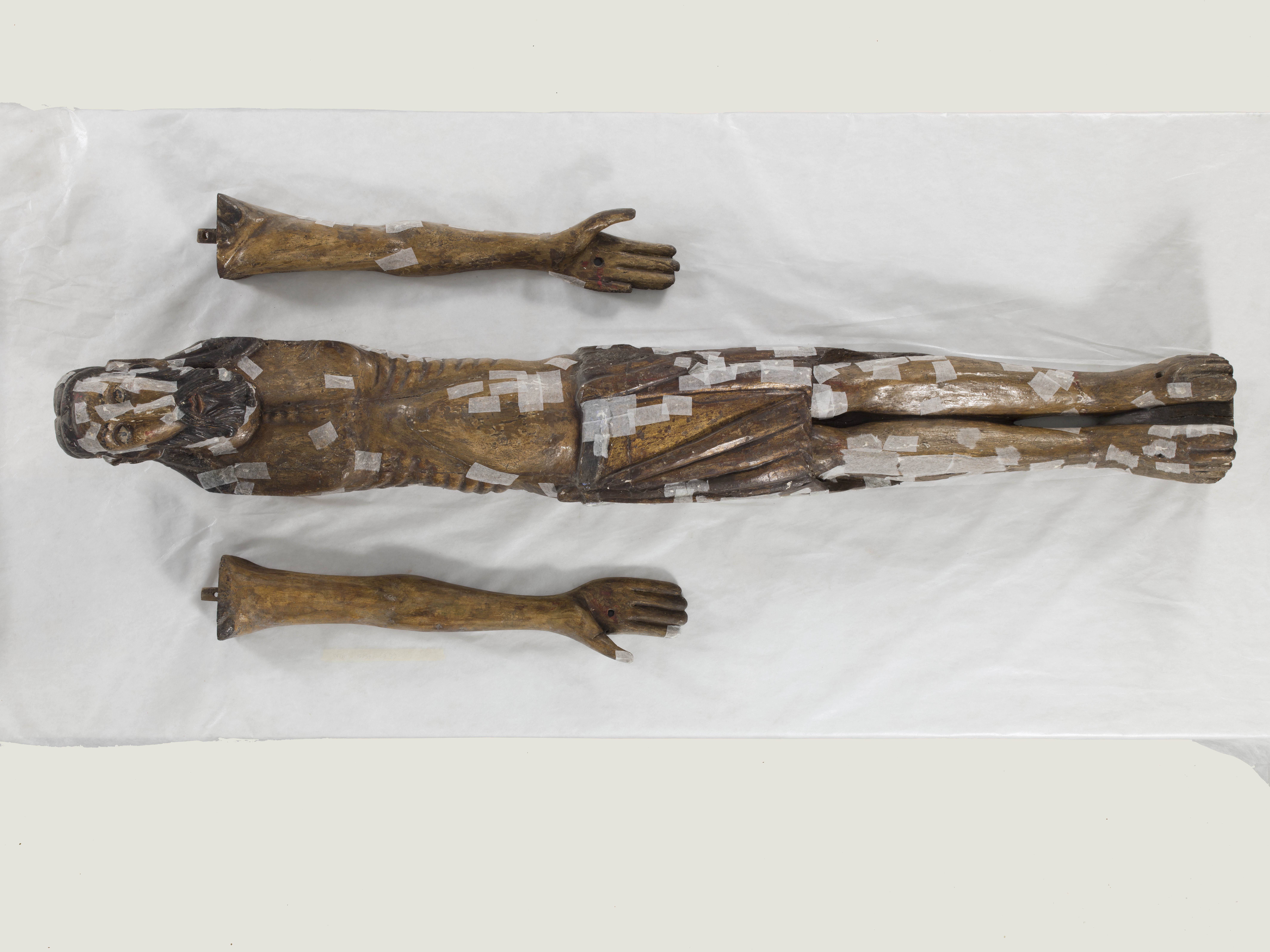 Es podia constatar, pel que fa a intervencions anteriors a la talla, que el braç dret de l’escultura és de factura moderna i no correspon al moment constructiu de la talla. A més, el pas del temps havia provocat contraccions i moviments en el material, que havien generat l’aparició d’algunes esquerdes, majoritàriament en sentit longitudinal, que afectaven tant l’anvers com el revers de la talla. També hi havia certa separació entre les diverses peces que formen el Crist.