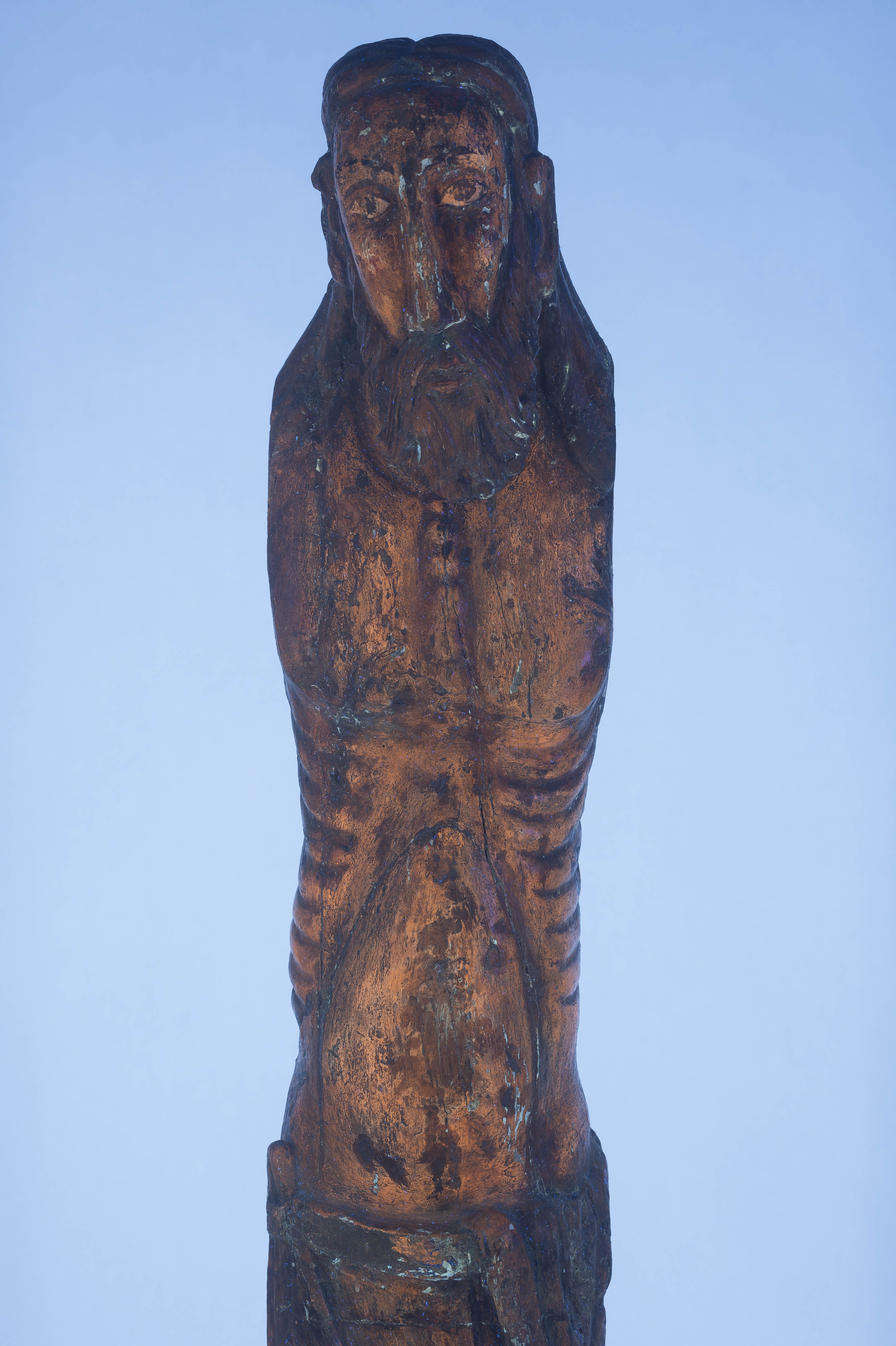 - L’escultura, de fusta de pi i policromada, es trobava en un estat de conservació deficient, amb importants aixecaments i pèrdues de les capes de preparació i pictòrica, i presentava un enfosquiment generalitzat que n’ocultava la policromia