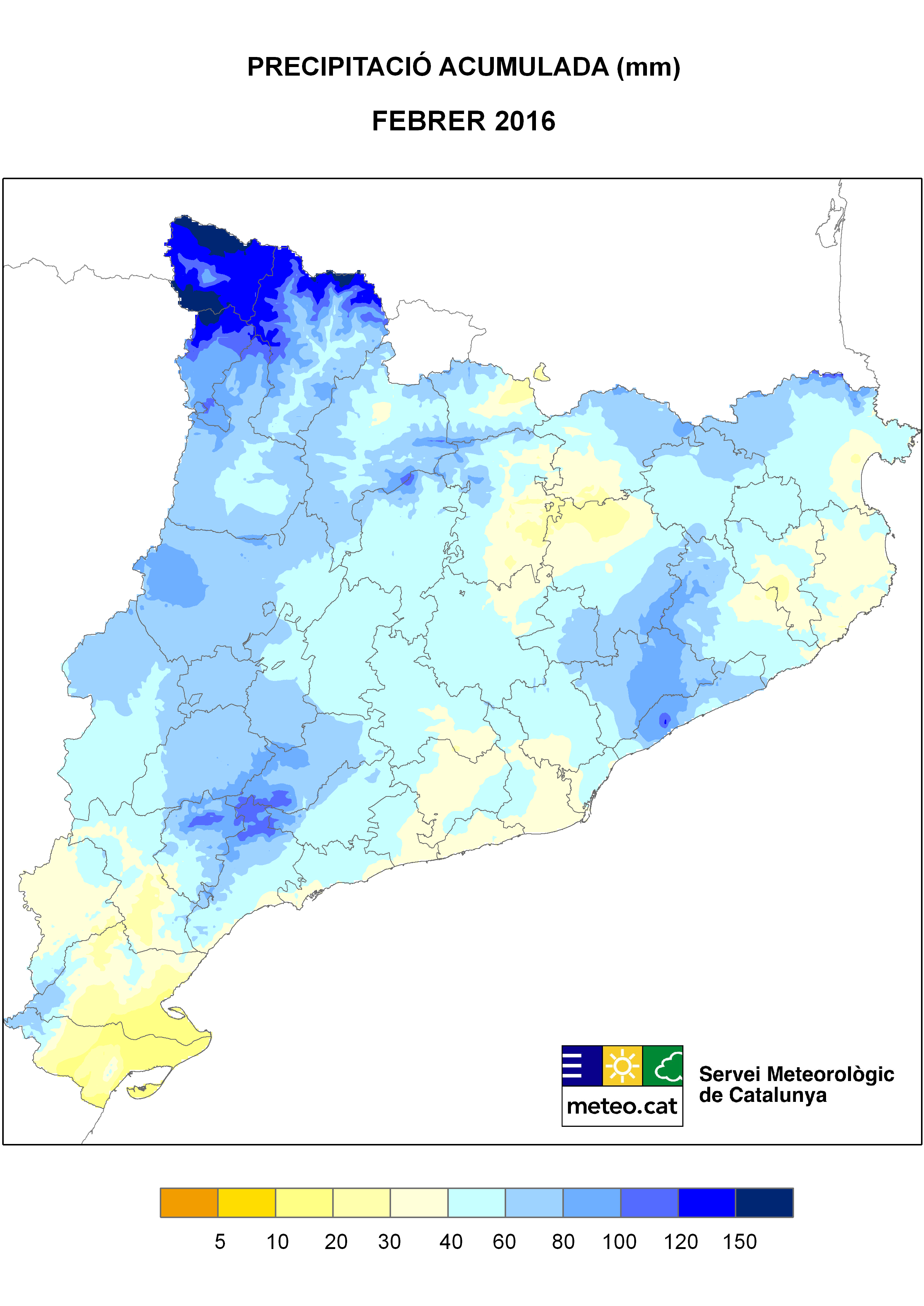 Cal remarcar que el febrer (juntament amb el mes de juliol) són els menys plujosos des d’un punt de vista climàtic. D’aquesta manera, els valors per sobre dels 40 mm que s’han enregistrat a molt punts del Principat (especialment entre els dies 26 i 28 de febrer), han estat suficients per a superar la mitjana climàtica mensual: aquesta última es situa entre els 20 mm a àmplies zones del terç oest i sud del país, i els 75 mm a les parts més elevades del Pirineu.