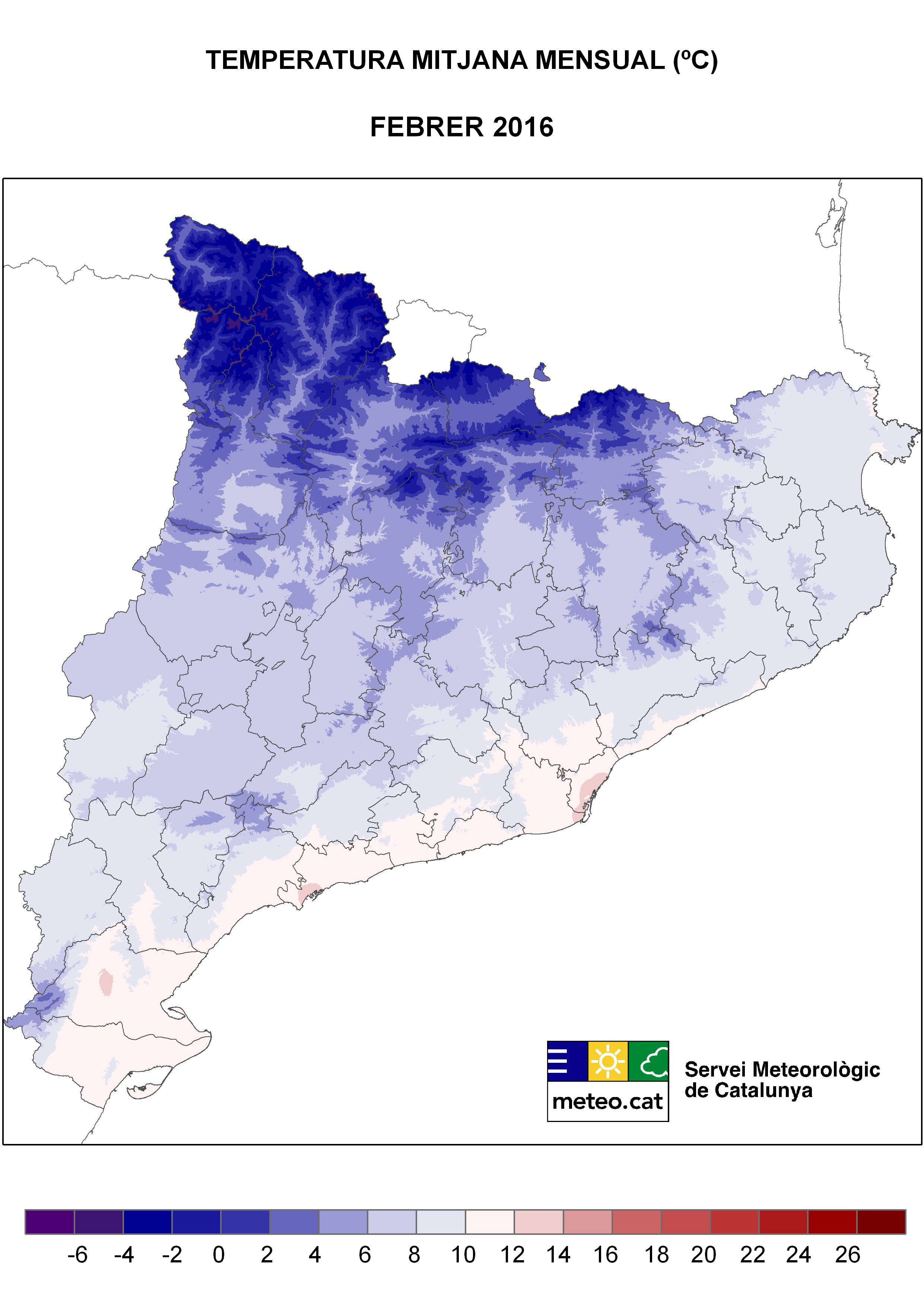 Pel que fa a la temperatura mitjana mensual, el febrer s’ha de qualificar com a càlid en general a gairebé tot Catalunya, especialment a la conurbació de Barcelona, i a àmplies zones del Prelitoral, de la depressió Central i del Prepirineu (Figura 1).