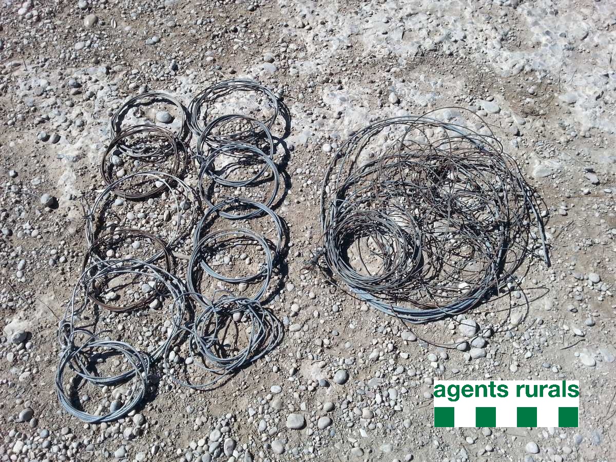 Efectius del Cos d’Agents Rurals van comissar un total de 12 paranys il·legals tipus llaç durant una inspecció d’un tancat amb gossos de caça en una finca del municipi de la Pobla de Cérvoles ( les Garrigues).