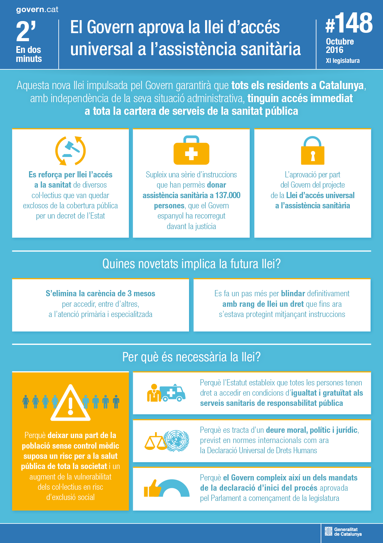 10 març 2016 09:11 event_note Nota de premsa Comunicació del Govern #148El Govern impulsa la llei d'accés universal a l'assistència sanitària La llei garantirà que tots els residents a Catalunya tinguin accés immediat a tota la cartera de serveis de la sanitat pública 1Fitxers adjuntsFitxers adjunts #148_Llei_sanitària 184Comparteix: