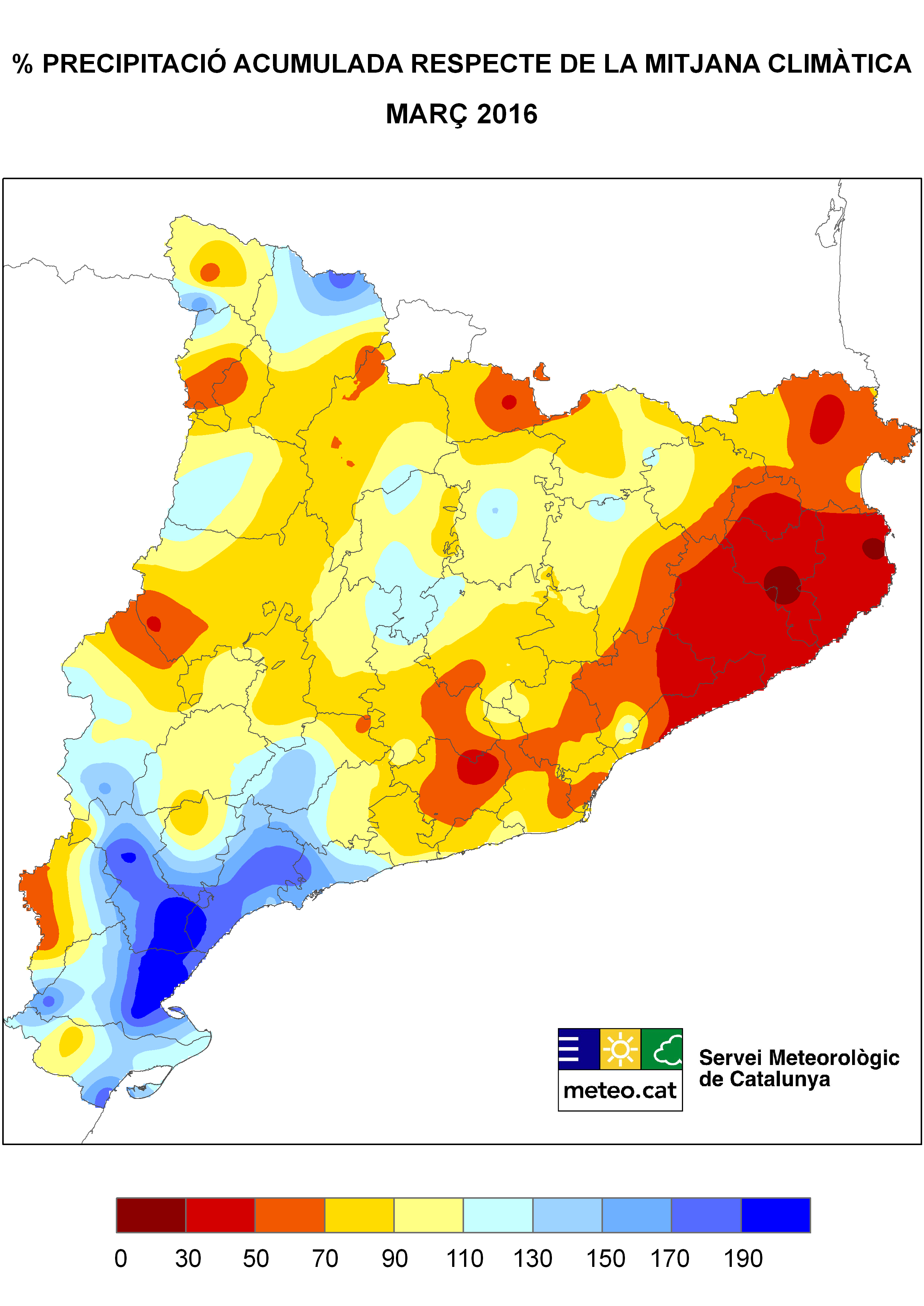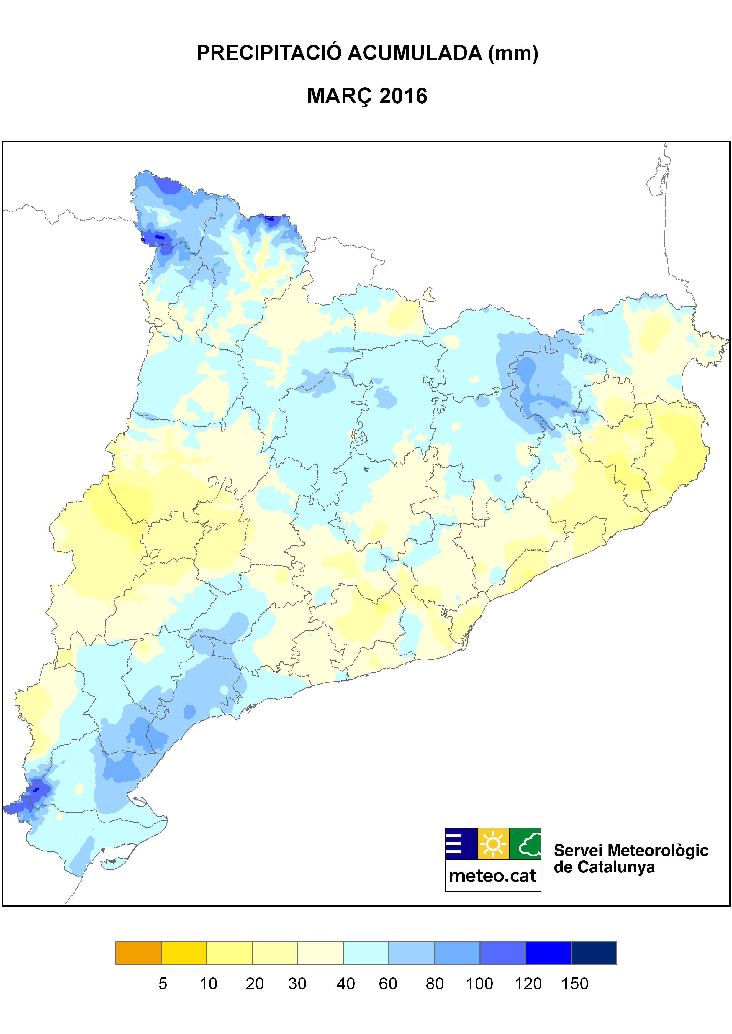- Pluviomètricament, el mes de març ha estat normal o plujós a gran part del quadrant sud-occidental del Principat, àmplies zones del Prepirineu i a les parts més elevades del Pallars Sobirà i la Val d’Aran; i molt plujós a punts del Baix Ebre i de la Ribera d’Ebre. En canvi, ha estat sec a gran part de les depressions i fons de vall de Catalunya i al quadrant nord-oriental del país i fins i tot molt sec a punts del Baix Empordà i la Selva