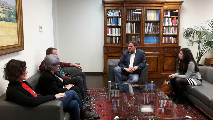 Oriol Junqueras ha recollit les opinions i greuges exposats pels emissaris de la plataforma i ha assegurat al final que els traslladarà a la Vicepresidenta. El vicepresident ha criticat que el Govern espanyol recorre pràcticament totes les Lleis del Parlament de Catalunya: “aquests dies, després de la reunió entre ambdós presidents, la bateria de decisions i suspensions que ha impulsat el govern espanyol és molt nombrosa, encara més que mai”. En aquest sentit, ha assegurat que el Govern seguirà garantint els drets bàsics dels ciutadans de Catalunya, siguin quines siguin les decisions que prenguin el Govern espanyol i el Tribunal Constitucional, perquè “els drets dels ciutadans estan per sobre de qualsevol consideració política que puguin fer un determinat partit, en aquest cas el PP”, ha afegit.