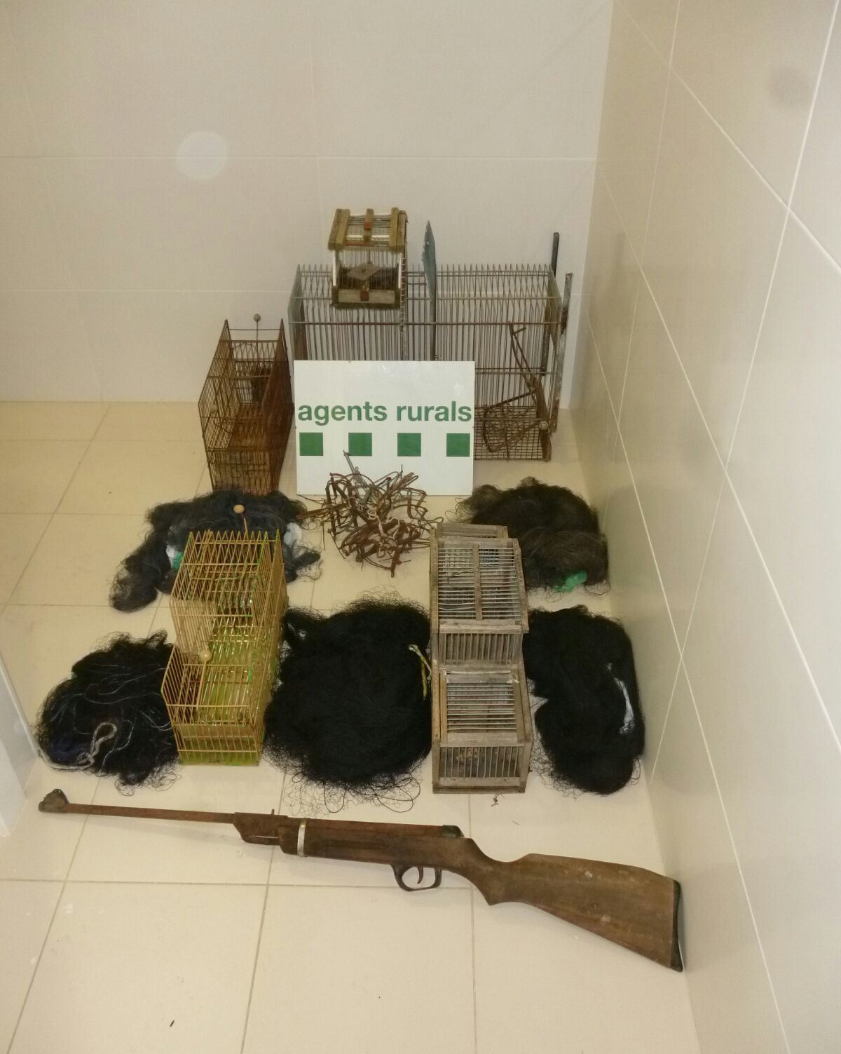 Finalment, els agents van recollir, precintar i custodiar l’exemplar mort, juntament amb d’altres proves trobades a la zona. També es van intervenir diversos esquers presumptaments enverinats i tot un important arsenal per a la pràctica del furtivisme: 20 ballestes, 4 gàbies trampa per a la captura d’ocells, 1 gàbia trampa per a mamífers, 5 xarxes japoneses invisibles més 1 escopeta de balins. Tots són arts de caça prohibits i van ser retirats de la zona a fi d’evitar la mort tant de fauna silvestre com de gossos dels veïns. A part, es va efectuar una inspecció ocular a les instal·lacions en presència de la persona, que va ser identificada, fet que va permetre localitzar i recollir més proves indiciàries de l’ús de verins contra la fauna salvatge.