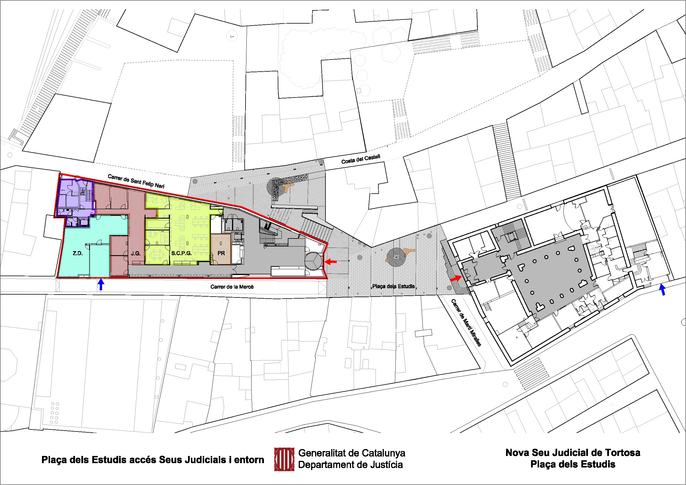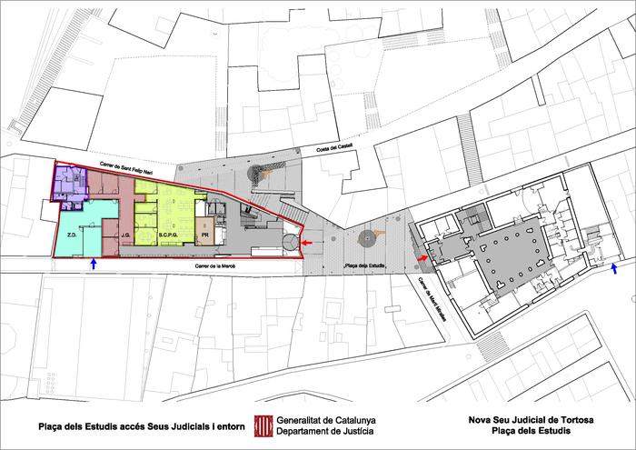 Les obres també inclouen la reurbanització de la plaça dels Estudis i d’una placeta al carrer Sant Felip Neri. Aquests espais públics faran de nexe entre els dos edificis i formaran part del nou pol judicial de Tortosa.