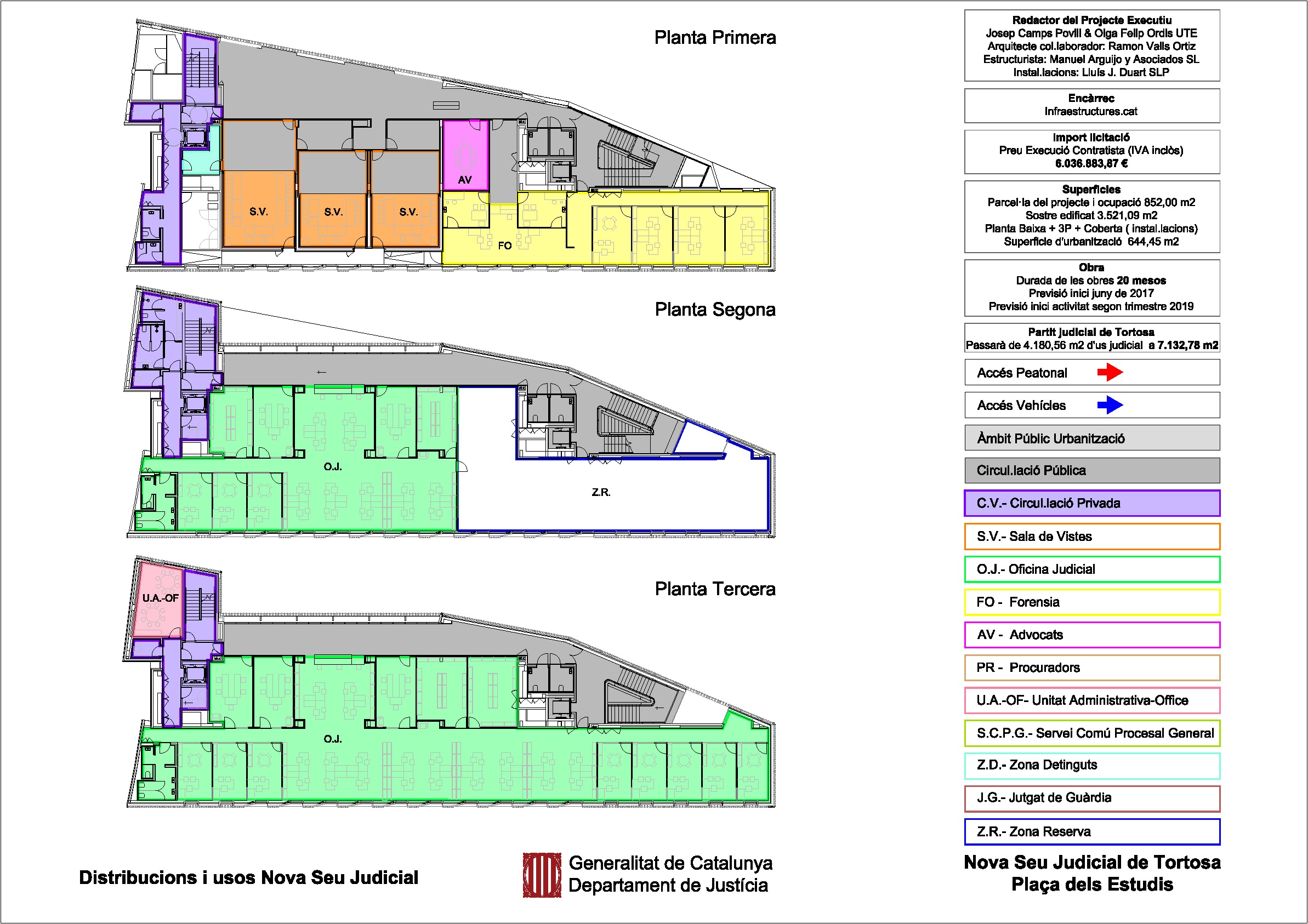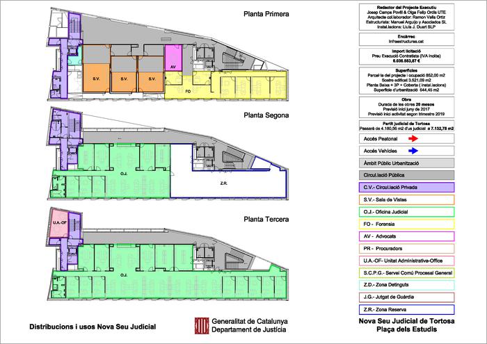 El nou equipament tindrà una superfície útil de 3.300 metres quadrats, distribuïts entre una planta baixa i tres pisos d’alçada. D’aquesta manera, les dues seus judicials de Tortosa sumaran més de 7.500 metres quadrats. És a dir, que el conjunt dels jutjats disposarà de pràcticament el doble d’espai que fins ara.