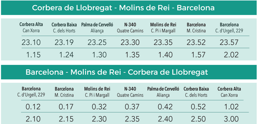 Així, s’afegiran 4 expedicions més (2 d’anada i 2 de tornada) els dissabtes a la nit, que se sumaran a l’oferta existent d’aquesta línia, que comprèn 13 expedicions diàries (8 d’anada i 5 de tornada). Així, s’oferiran sortides a les 23.10h i 1.15h des de Corbera de Llobregat, i a les 0.12h i 2.10h des de Barcelona. L’any passat més de 719.000 viatgers van utilitzar aquesta línia de bus exprés.cat, que es va posar en servei el 2014.