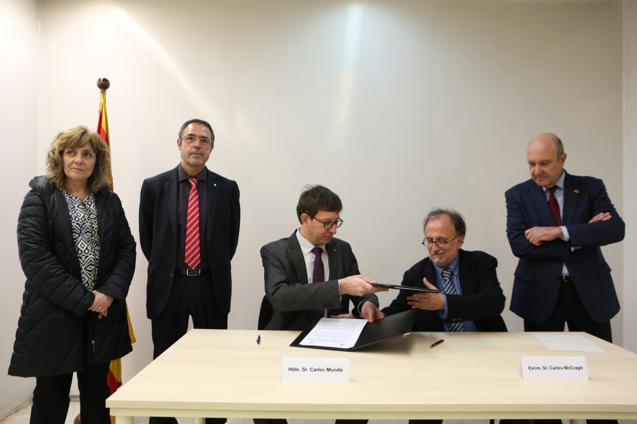L’Acord per a la implantació de la comunicació per videoconferència, l’han signat, aquest dijous a la tarda, el conseller de Justícia, Carles Mundó, i el president del Consell de l’Advocacia de Catalunya, Carles McCragh, després de visitar les noves instal·lacions de Brians 1.