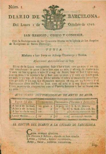 L'1 d'octubre de 1792 sortia a la llum el primer número del Diario de Barcelona. Era l'inici d'una de les publicacions amb més continuïtat i més influent en la història de la premsa de Catalunya.