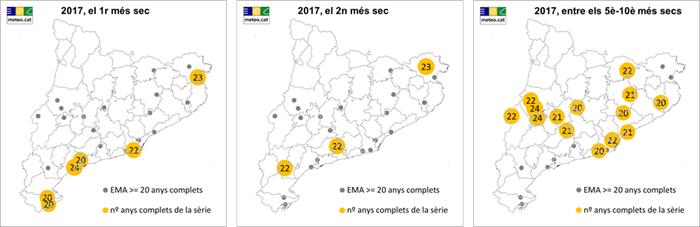 A 6 de les EMA amb un mínim de vint anys de dades, el 2017 ha estat l’any més sec, totes ells ubicades al litoral; a la resta d’aquestes 23 EMA se situa entre els 10 més secs.