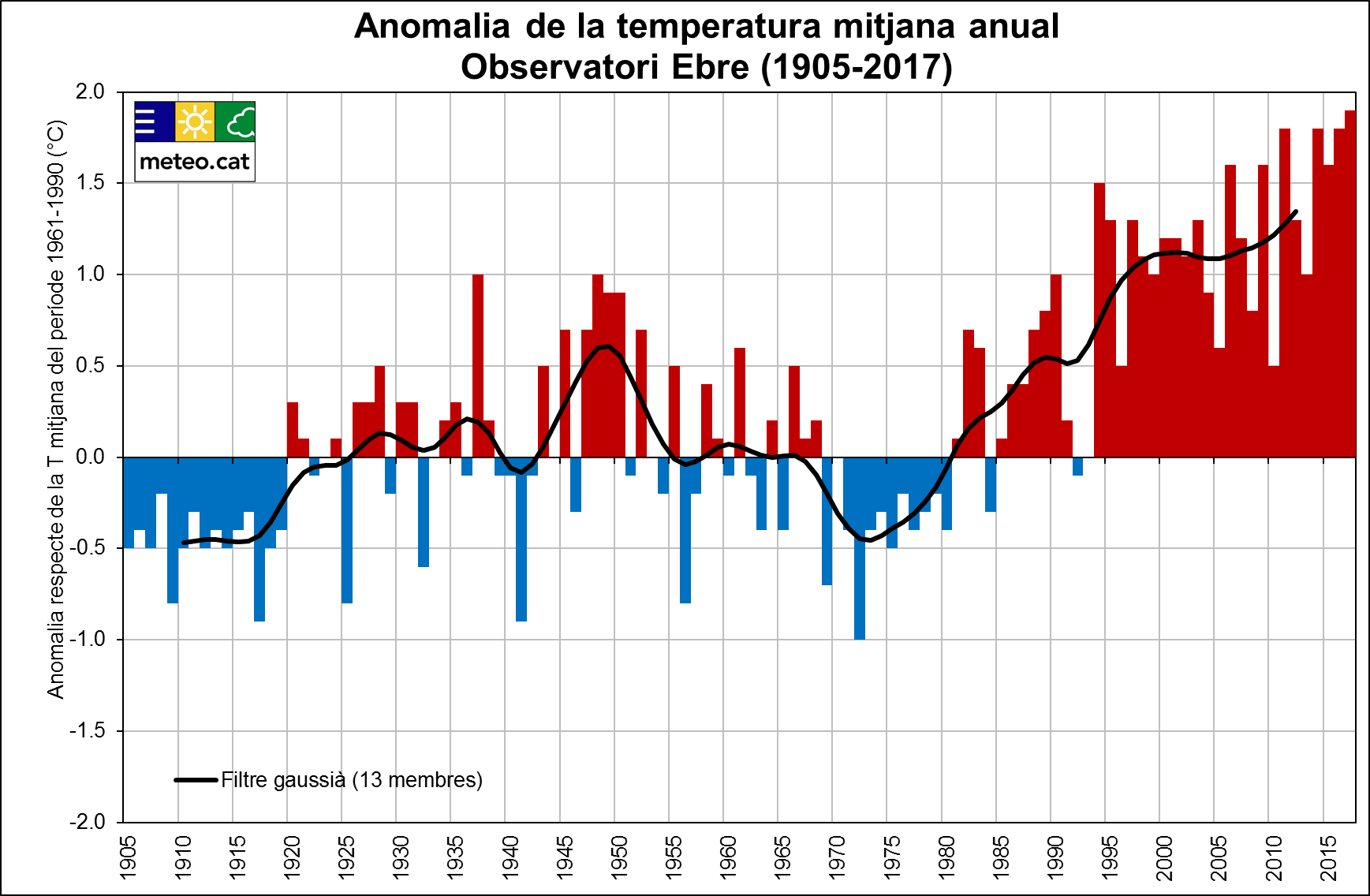 Pel que fa a les estacions que són centenàries, el 2017 se situa també entre els més càlids, essent a l’Observatori de l’Ebre l’any més càlid dels darrers 113 anys.