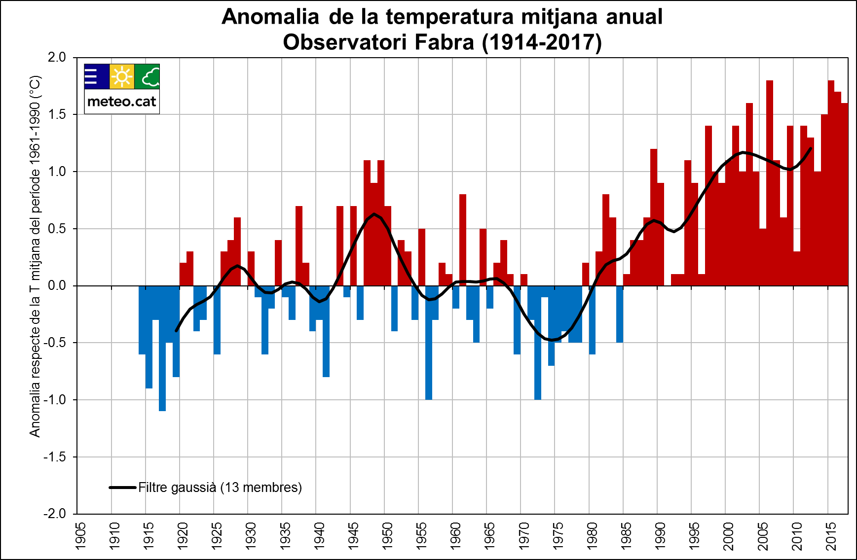 L’any 2017 s’ha de qualificar de càlid a Catalunya, ja que a gairebé la totalitat del Principat la temperatura mitjana anual (figura 1) s’ha situat en valors superiors a +0,5 °C respecte de la mitjana climàtica del període de referència 1961-90. Només en alguns punts de Ponent, del delta de l’Ebre i de les muntanyes de Prades, l’any es pot qualificar de termomètricament normal.