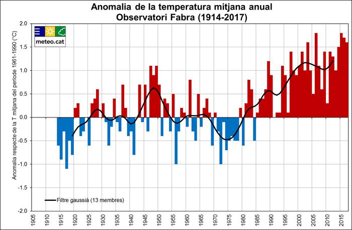 A l’Observatori Fabra, la temperatura mitjana de l’any 2017 (figura 4) ha estat de 16,4 °C, valor idèntic al de l’any 2003, i que significa el tercer valor més càlid assolit en la seva sèrie de 104 anys, lleugerament inferior a la temperatura mitjana anual dels anys 2006, 2016, i també del 2015 que amb 16,6 °C, és de moment el més càlid. L’anomalia respecte de la mitjana climàtica 1961-1990 és de +1,7 °C. Al llarg de l’any s’han donat diversos mesos amb valors de temperatura clarament per damunt de la mitjana entre febrer i setembre però va destacar sobretot el mes de juny amb una anomalia de +3,9 °C.