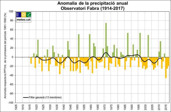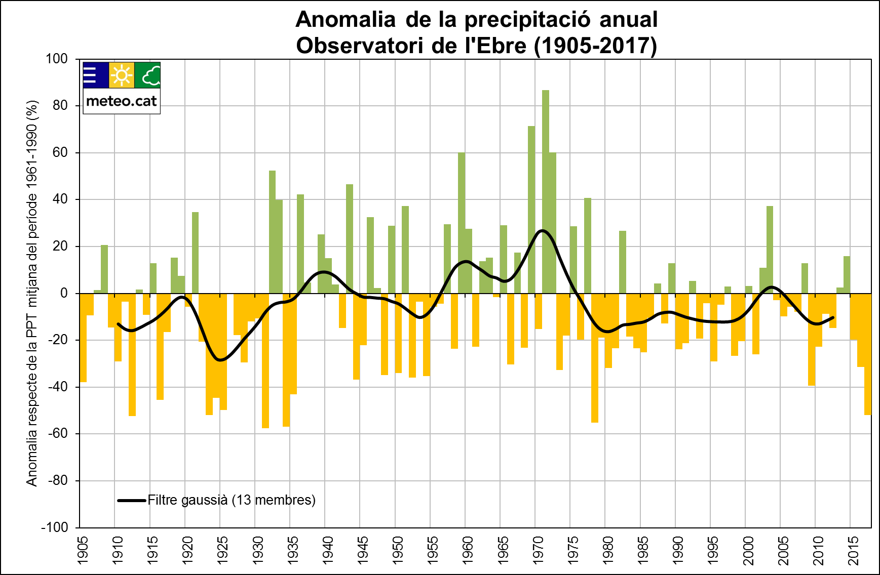 Figura 3: Evolució de l’anomalia de la precipitació anual a l’Observatori de l'Ebre (1905-2017) i a l’Observatori Fabra (1914-2017)