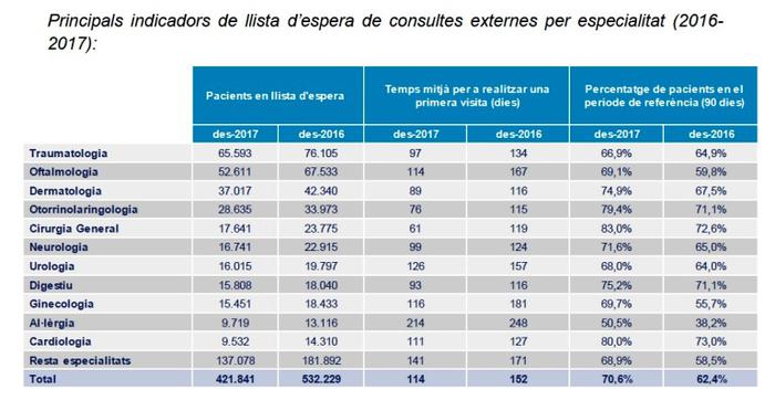 Respecte al desembre de 2016, en acabar l’any 2017 es va comptabilitzar un 20,7% menys de pacients en espera per a consultes externes (421.841 pacients). El temps mitjà d’espera global per primera visita se situa en 114 dies, amb el que s’aconsegueix una disminució del 25% (38 dies menys en comparació amb el 2016). Es redueix en més de 75.000 el nombre de pacients que esperen més de 90 dies per ser visitats, xifra que suposa una reducció del 38%.