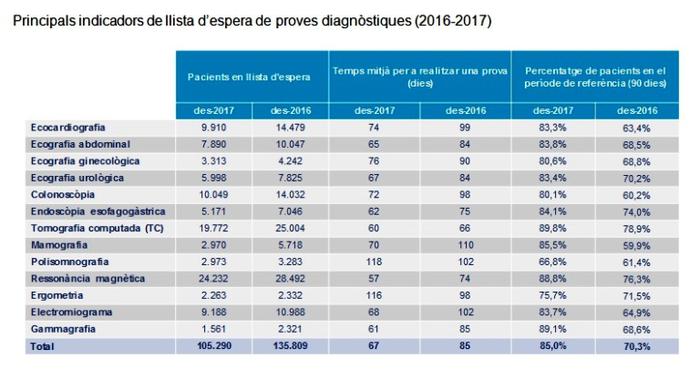 Les proves diagnòstiques es van incrementar un 5% respecte a l’any 2016. Es van fer més de 700.000, el que suposa un augment del 35% respecte a l’any 2010. En aquest àmbit ha disminuït el nombre de pacients en espera per a totes les proves diagnòstiques: en concret, una reducció del 22,5% respecte al 2016, el que suposa 30.519 pacients menys (passa de 135.809 a 105.290 pacients).