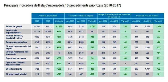 El temps mitjà d’espera dels pacients en llista d’espera és de 144 dies, mentre que l’any 2016 se situava en 170, el que suposa una disminució del 15,3%. A més, s’ha reduït en 1.019 el nombre de pacients que esperen una intervenció: en concret, al desembre de 2017 hi havia 163.809 pacients en llista d’espera, mentre que un any abans hi havia 164.828. Aquesta reducció cobra més rellevància tenint en compte l’augment de nous pacients derivats amb indicació quirúrgica per l’increment d’activitat en consultes externes i proves diagnòstiques.