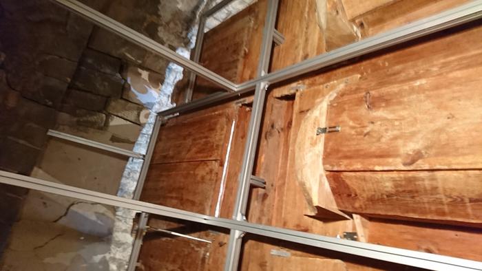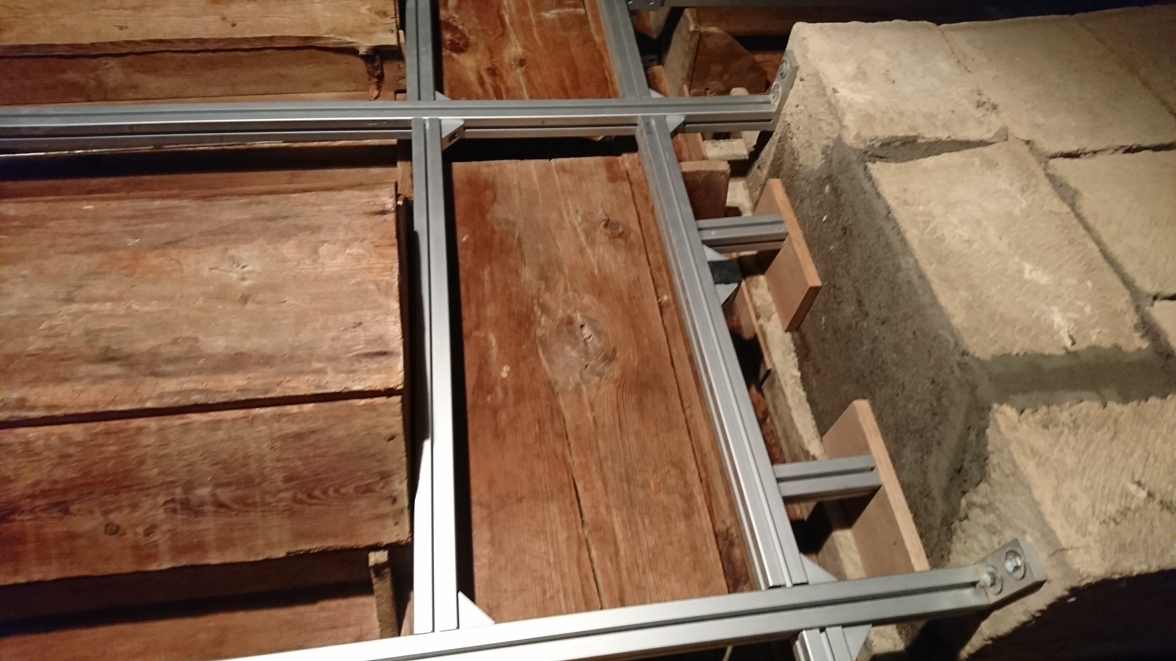 Finalment, per al muntatge definitiu, aquest mes de febrer s’ha construït una estructura de perfils metàl·lics d’alumini anoditzat, que el subjecta pel darrere i dóna, de nou, l’estabilitat necessària al conjunt.
