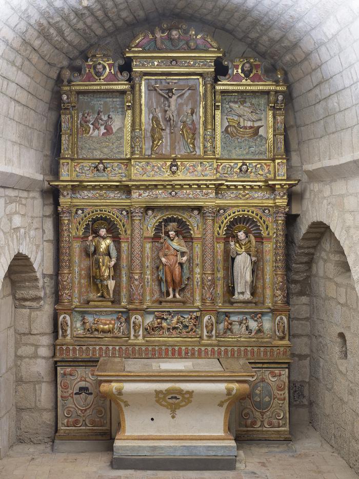 La predel·la acull tres escenes en relleu de la vida dels tres sants. El basament té, al centre, un gran altar barroc, amb formes corbades, flanquejat, a banda i banda, per uns plafons on hi trobem, tallats en relleu, símbols iconogràfics de sant Jaume.