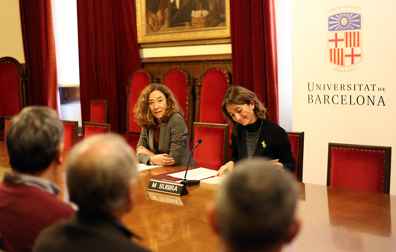 La vicerectora d’Igualtat i Acció Social de la Universitat de Barcelona (UB), Maite Vilalta, ha formalitzat aquest dimecres l’adhesió de la institució al Programa d’acords voluntaris per a la reducció d’emissions de gasos amb efecte d’hivernacle (GEH) de la Generalitat en presència de la secretària de Medi Ambient i Sostenibilitat, Marta Subirà.