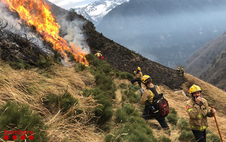 Durant les tasques d’extinció han treballat efectius dels Bombers de la Generalitat i dels Pompiers d’Aran. Efectius del GRAF han utilitzat eines manuals i han fet ús de foc tècnic per fer cremes de definició de perímetre i d’eixamplament amb el suport de dos helicòpters. A la nit, i per tal de garantir la seguretat dels efectius a causa de l’orografia (amb fortes pendents), la possibilitat de rodolaments de grans pedres, i les temperatures extremadament baixes, els bombers s’han retirat de la zona, i s’ha fet seguiment de l’incendi des de Vielha, on s’hi ha desplaçat el Grup de Suport Logístic i s’ha instal·lat el Centre de Comandament de Bombers.