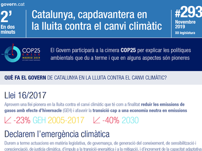 Així mateix, en la línia dels governs més avançats a escala mundial, el Govern català va declarar formalment l’emergència climàtica el passat mes de maig, per assolir objectius en matèria de mitigació establerts. I d’aquesta declaració n’ha sorgit l’organització, el pròxim 17 de gener de la primera Cimera catalana davant l’emergència climàtica.