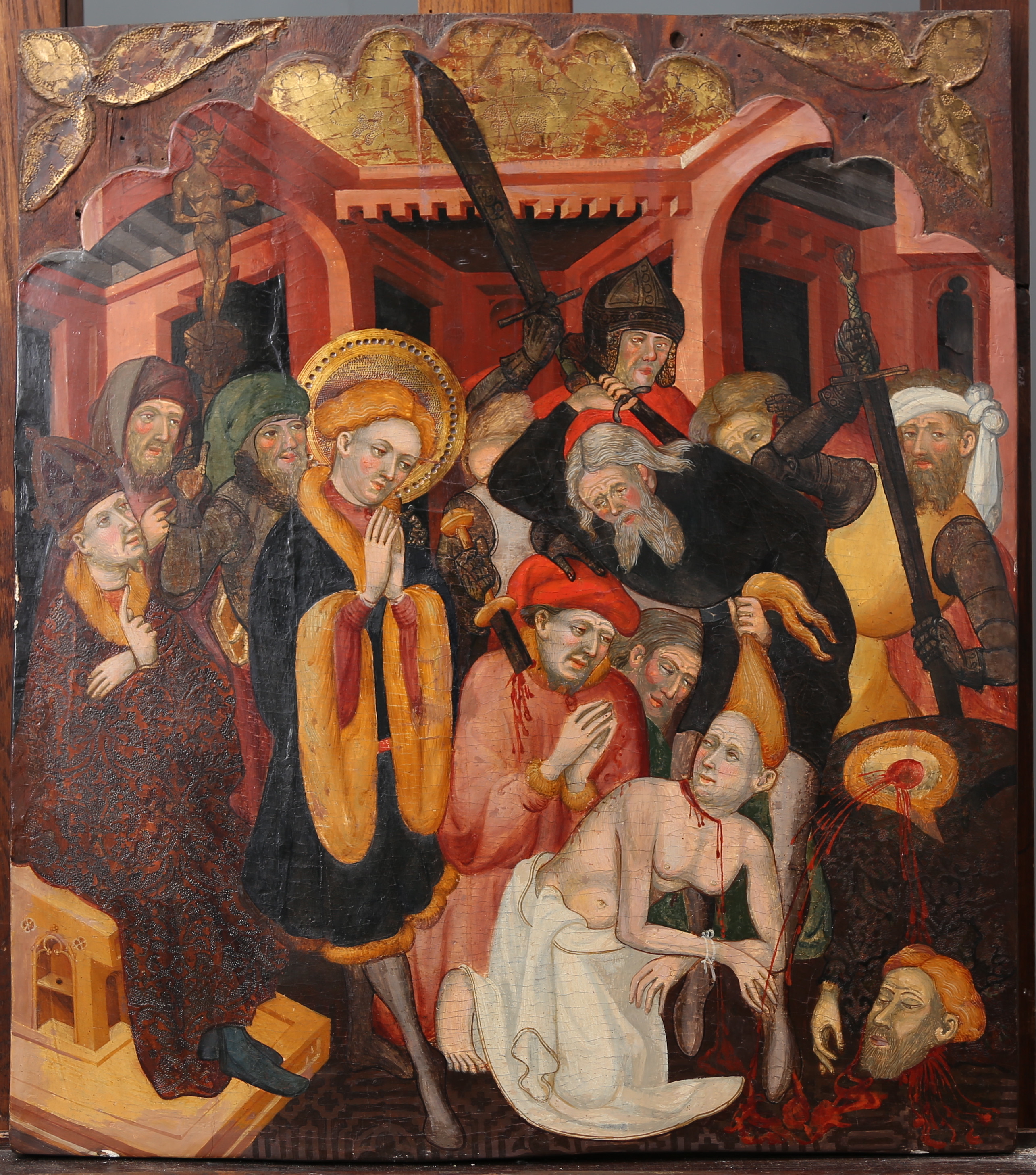 L’escena representada, la Decapitació dels familiars de sant Hipòlit, s’emplaça davant d'un artificiós fons arquitectònic de parets rosades i presenta el prefecte Valerià assegut en un tron a l'extrem esquerre de la composició. Enfront del mandatari, que està acompanyat per dos sequaços davant d'un ídol pagà, hi ha sant Hipòlit. Nimbat i vestit amb riques vestidures amb pells, aquest li dona l'esquena i adreça la mirada cap a la meitat dreta de la pintura. Allí s'hi representa pròpiament l'ajusticiament dels familiars del sant en una composició agitada i atapeïda, integrada per nou personatges. Darrere, drets, els botxins dirigeixen les espases contra els màrtirs, que rauen agenollats. Veiem, per exemple, com a l'extrem dret un d'ells ja ha estat decapitat i sagna profusament o com, més al centre, un altre saig manté agafada pels cabells la dona que tot just acaba de degollar, segurament Concòrdia, la nodrissa del sant.
