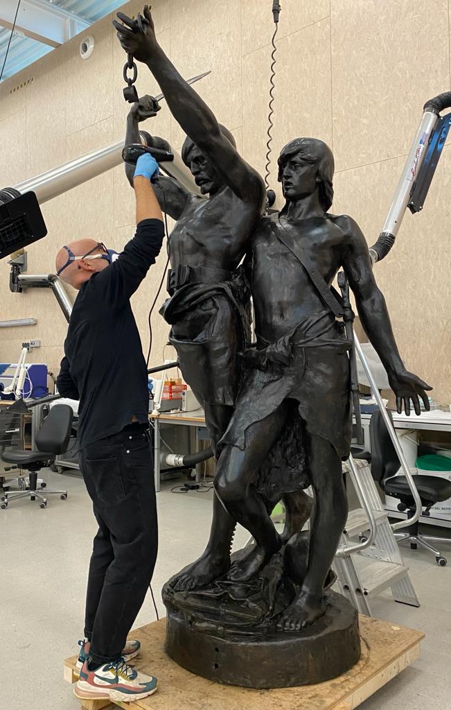 El procés de conservació i restauració del conjunt escultòric ha consistit, en primer lloc, en la realització d’un minuciós treball de recerca i localització de material fotogràfic en diversos arxius per poder fer un seguiment cronològic de les patologies que presentava i establir quines han estat les causes que les han ocasionat. Aquesta recerca ha servit per apuntalar tot l’estudi científic que s’ha realitzat i que ha consistit en el radiografiat i escanejat en alta resolució de l’obra i la realització d’anàlisis especialitzades en el laboratori del CRBMC i en el Centro Nacional de Investigacions Metalúrgicas (CENIM-CSIC). Aquest estudi ha permès conèixer amb profunditat la composició de metall, així com de la pàtina negra que en origen lluïa la pell d’aquest conjunt escultòric. Aquesta pàtina, a banda de tenir una clara intencionalitat estètica, també tenia una funció protectora del bronze per evitar l’alteració del metall en contacte amb els agents atmosfèrics. La seva desaparició cal trobar-la en l’exposició directa de l’obra a la contaminació procedent del trànsit rodat i en la realització d’una neteja agressiva en el passat.