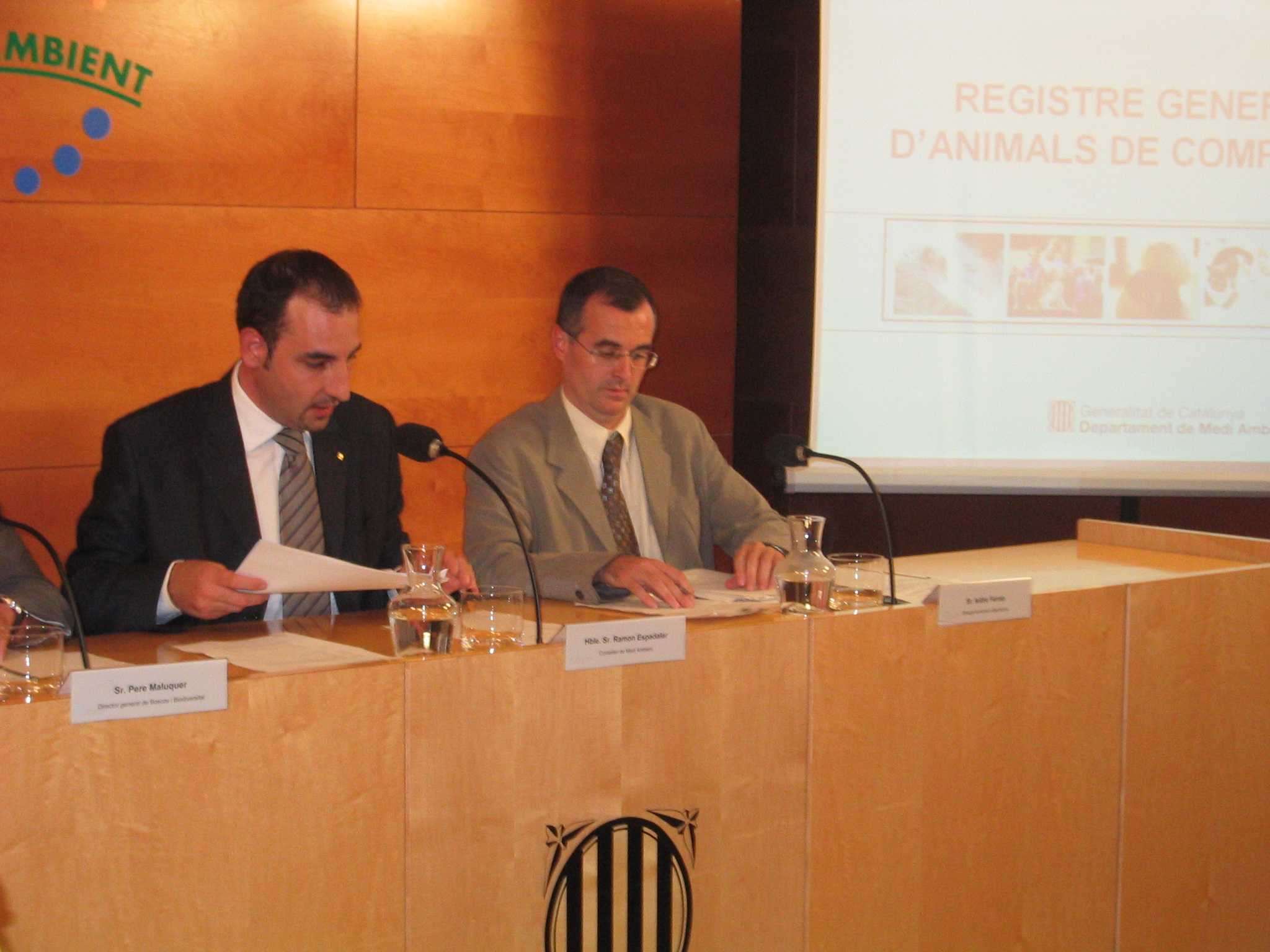 El conseller de Medi Ambient, Ramon Espadaler, acompanyat pel director general de Boscos i Biodiversitat, Pere Maluquer, i pel delegat territorial de Barcelona, Isidre Ferran, han presentat aquesta tarda als mitjans de comunicació el nou Registre General d’Animals de Companyia que permetrà censar els animals de companyia de tot Catalunya. Amb aquesta base de dades electrònica, tots els ajuntaments podran fer la consulta ’on line’ i saber, al moment, qui són els propietaris de l’animal amb la qual cosa se’ls hi podrà retornar en cas que s’hagi perdut i se’ls podrà sancionar en cas que s’hagi abandonat.