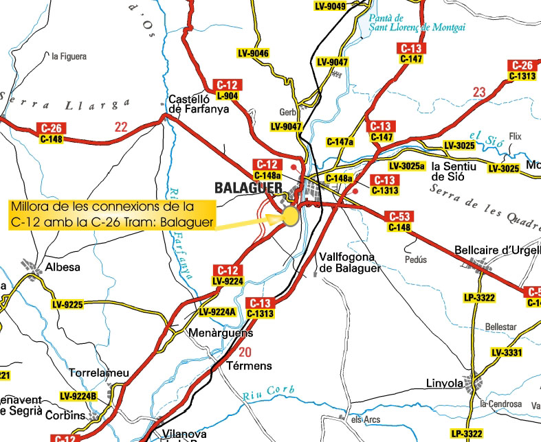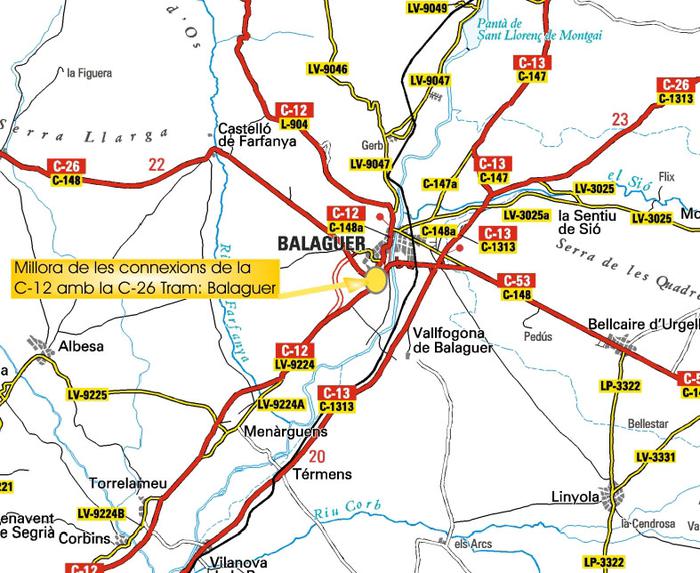L’enllaç amb la carretera C-26, es planteja amb una rotonda a diferent nivell, a la qual el tronc de la C-26 té continuïtat travessant de manera elevada la rotonda. Per tal de permetre aquest enllaç, caldrà realitzar dos ponts i modificar el traçat de l’actual C-26.