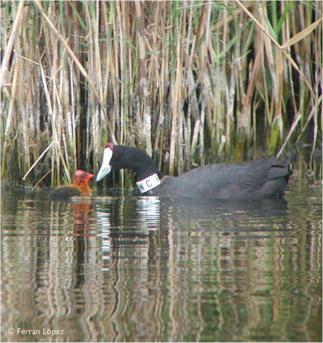 El dia 10 de juny de 2003 es va produir el naixement del primer poll i en dies successius van néixer dos més, fins un total de tres, que van ser fotografiats el dia 16 de juny. Els polls de fotja banyuda són nidífugs, és a dir, no resten al niu. En l’actualitat la parella es troba a la Reserva Natural Remolar-Filipines, a Viladecans, on alimenta les tres cries en les masses d’aigua permanents que ens resten.