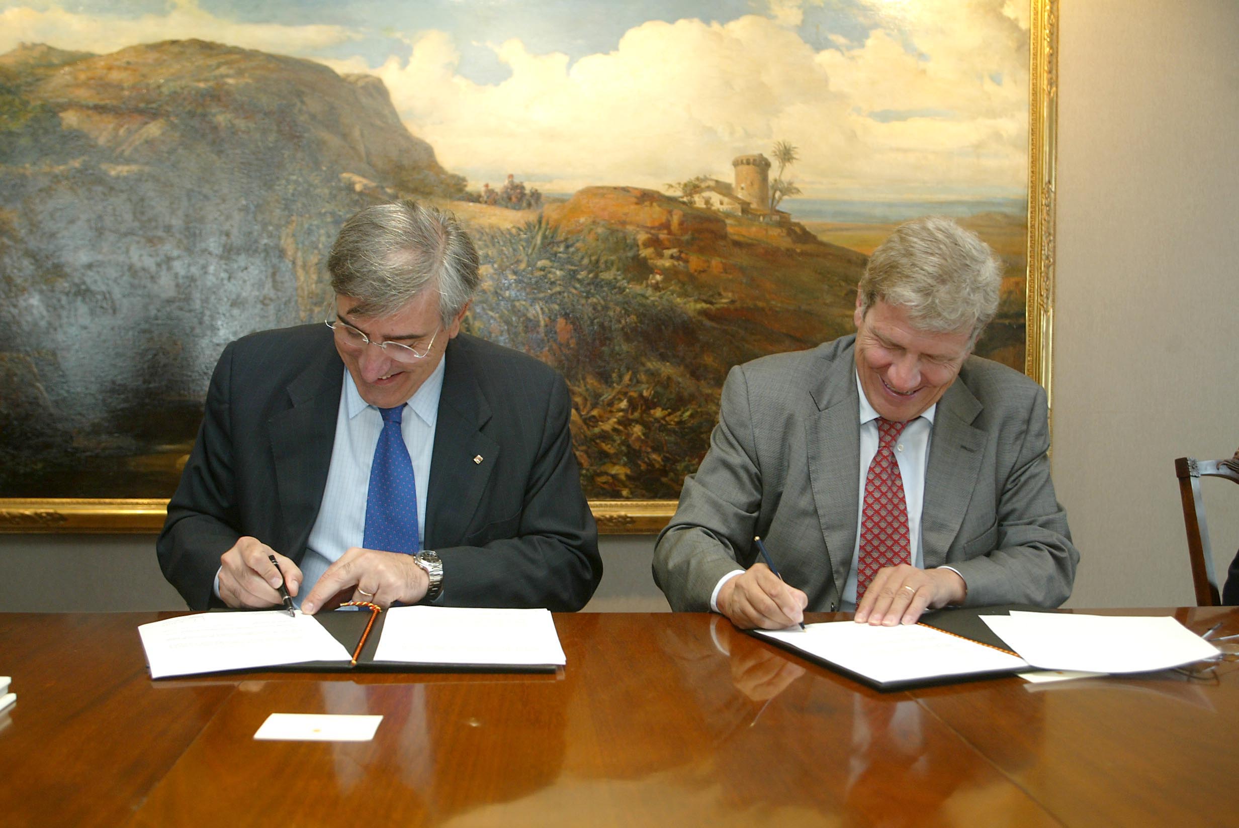 El conseller d’Economia i Finances, Francesc Homs, i el president de la societat Fira 2000, Josep Maria Cullell, han signat aquest matí el primer conveni de col·laboració d’ambdues institucions per al finançament de l’ampliació de la Fira de Barcelona. “L’acord formalitzat avui ens permetrà destinar recursos dels fons FEDER a l’ampliació de la Fira”, ha explicat Homs. Així, el conveni entre el Govern i Fira 2000 possibilita que la Generalitat presenti la documentació necessària a la Comissió Europea per obtenir 75M€ dels fons europeus.