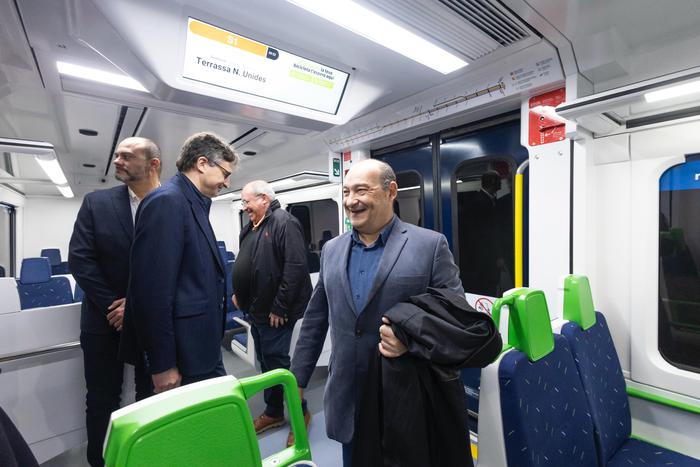 El president de Ferrocarrils, Carles Ruiz Novella, ha fet el recorregut inicial del tren renovat, juntament amb la directora de Material Mòbil i Xarxa Ferroviària, Esther García Torralbo, i el director d’FGC Operadora, Oriol Juncadella. El president d’FGC ha destacat que la rehabilitació d’aquests trens és possible “gràcies a la tasca de manteniment constant que fem a tots els vehicles del nostre parc mòbil. Aquest manteniment preventiu ens permet en el dia a dia prestar un servei públic de gran qualitat i, alhora, ara ens permet també renovar els trens més antics, per tal d’allargar-ne la vida útil uns quants anys més. En millorem els serveis i el disseny, tant interior com exterior, amb l’objectiu d’assimilar-los als trens més nous, els de la sèrie 115, que vam estrenar a finals del 2022”.