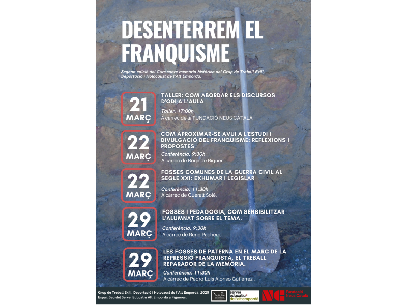 Aquest curs de formació docent, titulat ‘Desenterrem el Franquisme’ i que es celebrarà a la seu del Servei Educatiu de l’Alt Empordà a Figueres, té com a objectiu dotar d’eines i recursos als docents participants de qualsevol matèria, àmbit o nivell educatiu, per a combatre els falsos mites, la desinformació i les notícies falses al voltant del franquisme i generar noves propostes pedagògiques pel treball sobre la repressió del règim franquista i les exhumacions de les fosses comunes com a treball reparador de la memòria.