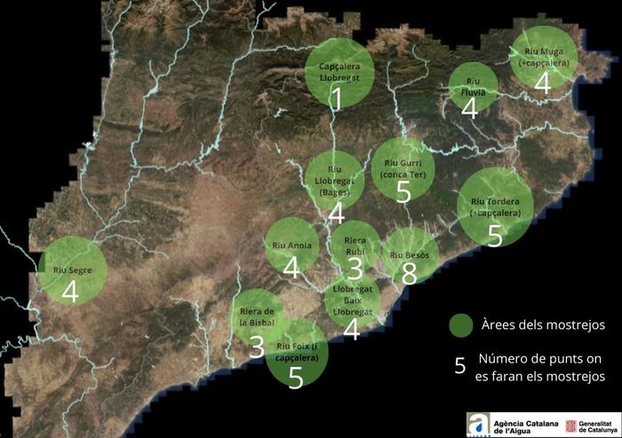 S’han escollit un total de 54 punts de mostreig a les principals conques fluvials catalanes, concretament en el riu Llobregat, la conca del Ter, la Muga, la Tordera, el Fluvià, el Besòs, el Foix, l’Anoia, el Segre i les rieres de Rubí i la Bisbal. En l’arxiu Excel que acompanya aquesta nota es detallen tots els punts de control.