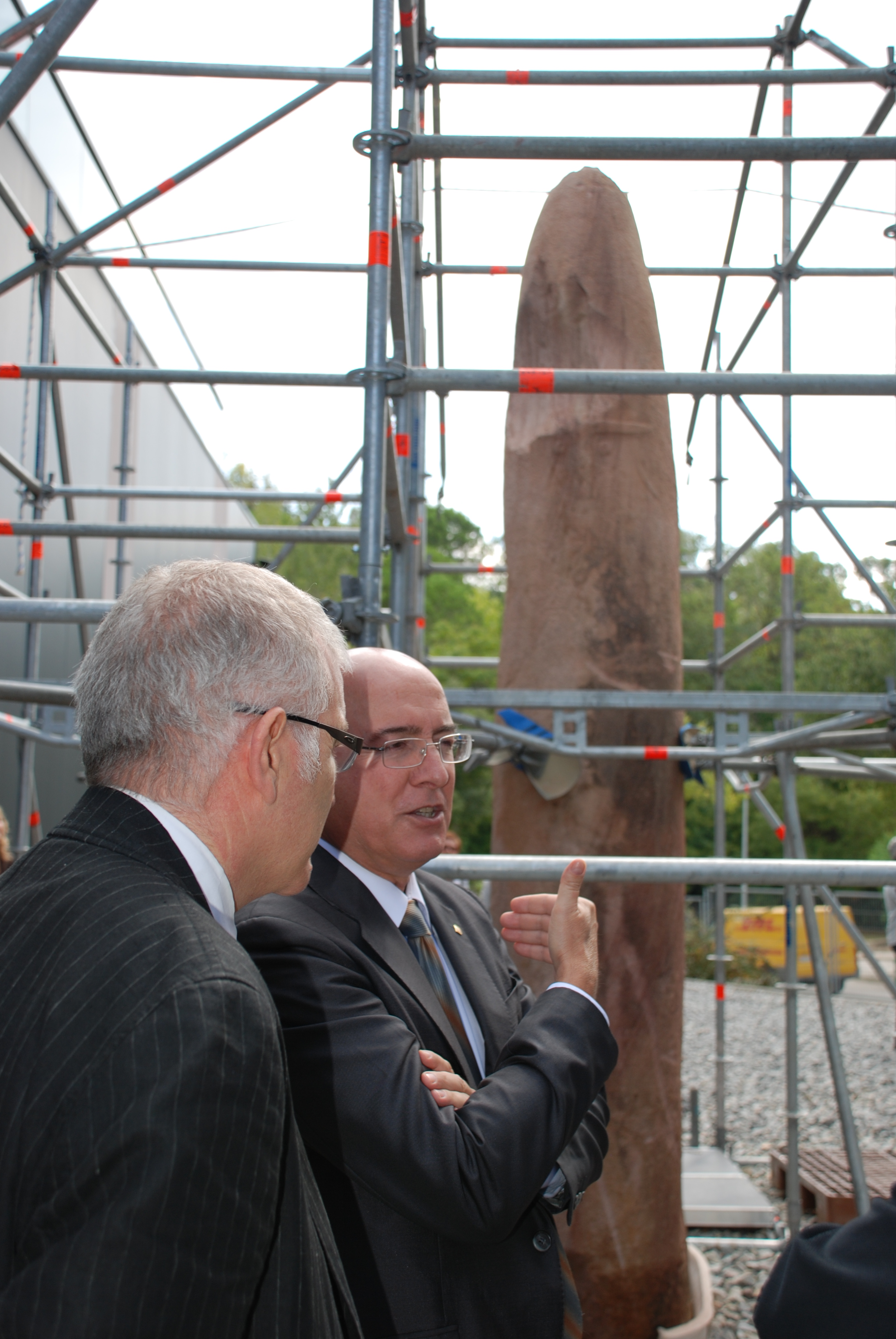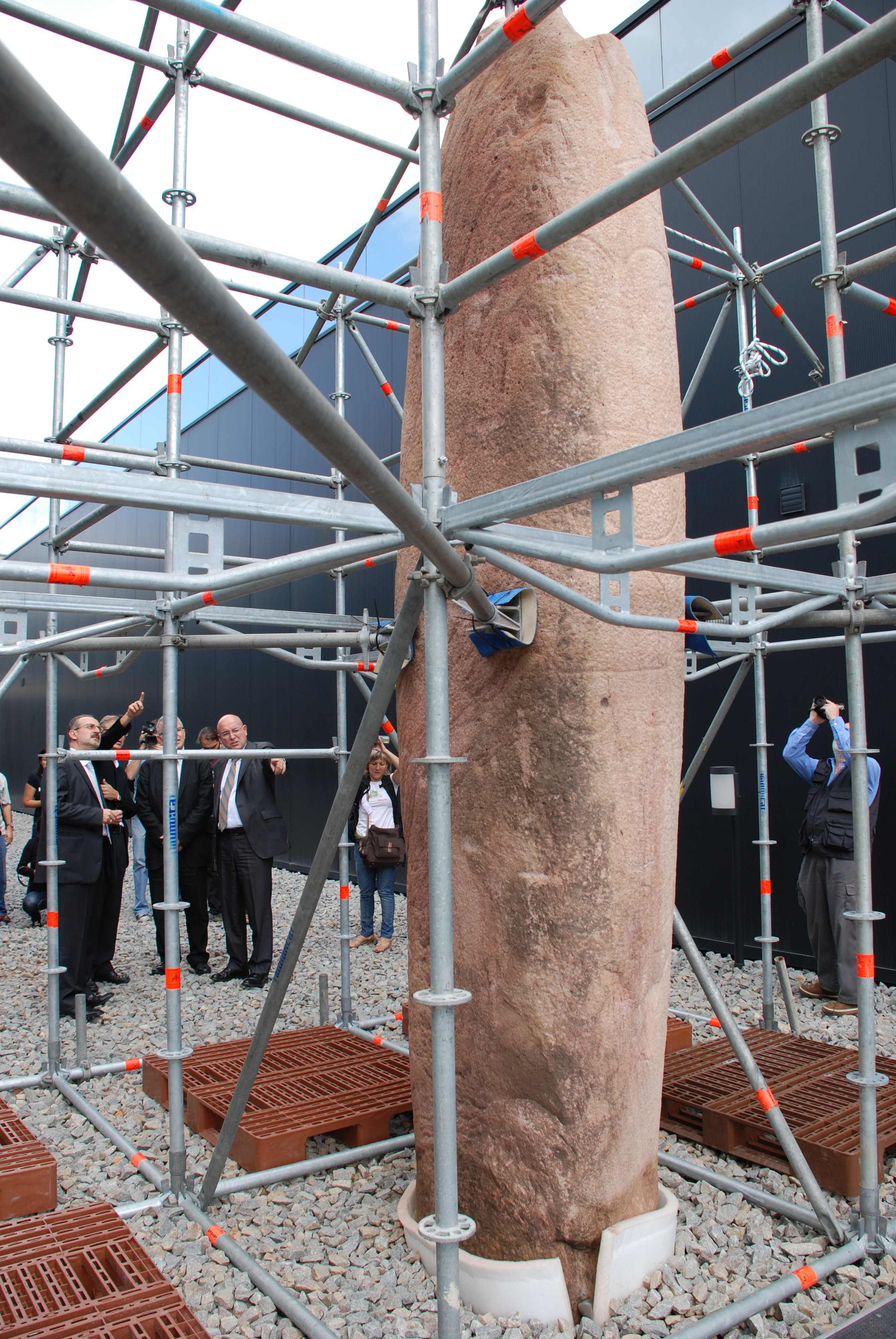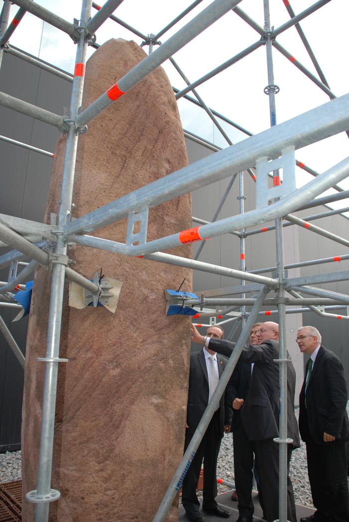 El conseller de Cultura i Mitjans de Comunicació, Joan Manuel Tresserras, i l’alcalde de Mollet del Vallès, Josep Monràs, han presentat avui en roda de premsa la restauració de l’estàtua menhir de grans dimensions que es va descobrir el passat mes d’abril durant unes obres de construcció d’un aparcament subterrani al Parc de les Pruneres de Mollet del Vallès (Vallès Oriental).
