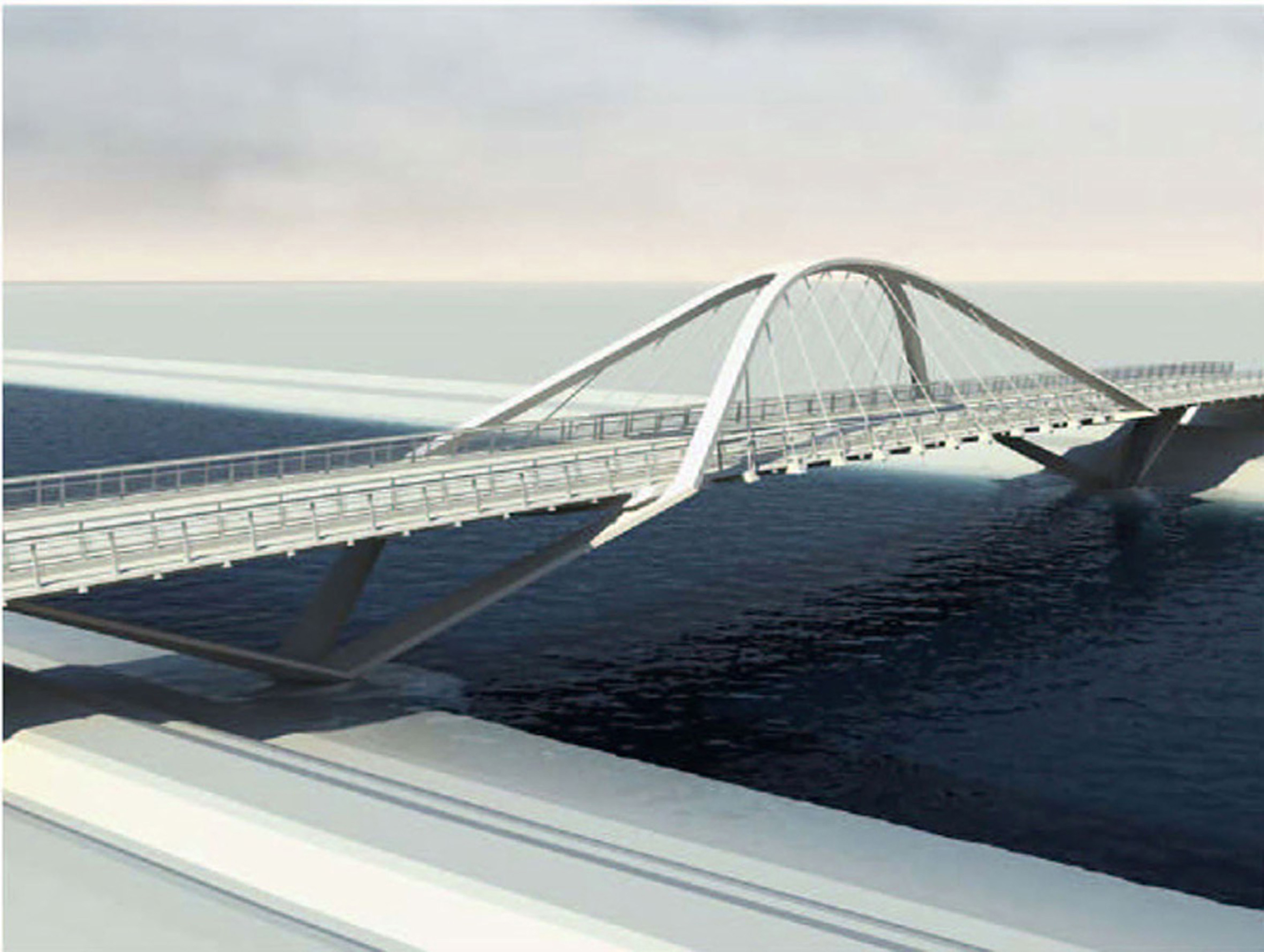 Les piles simples inclinades serveixen de recolzament intermedi al tauler i donen lloc a una estructura de cinc trams. Les piles dobles s’obren suament i recullen els dos arcs i el tauler de l’estructura i els arcs conflueixen en una peça d’unió central.