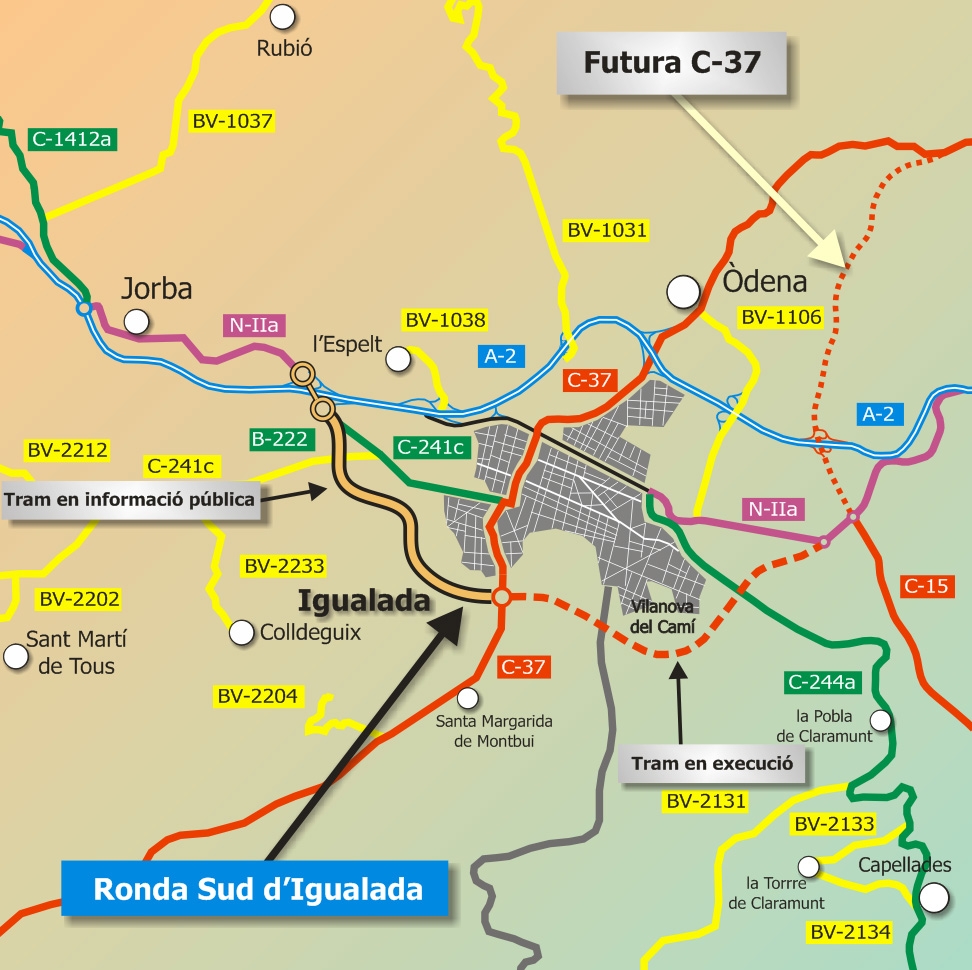 Així, la ronda Sud conformarà, juntament amb l’A-2, la xarxa arterial d’Igualada i permetrà ordenar el trànsit dels futurs creixements en l’àmbit més meridional de la Conca d’Òdena i dels polígons a l’entorn de Vilanova del Camí. Al mateix temps, canalitzarà els moviments de la C-37 a mesura que es consolidi aquest eix viari entre l’Anoia, la Conca de Barberà i el Camp de Tarragona. Es preveu que la ronda sud d’Igualada completa signifiqui una inversió total de 56 MEUR.