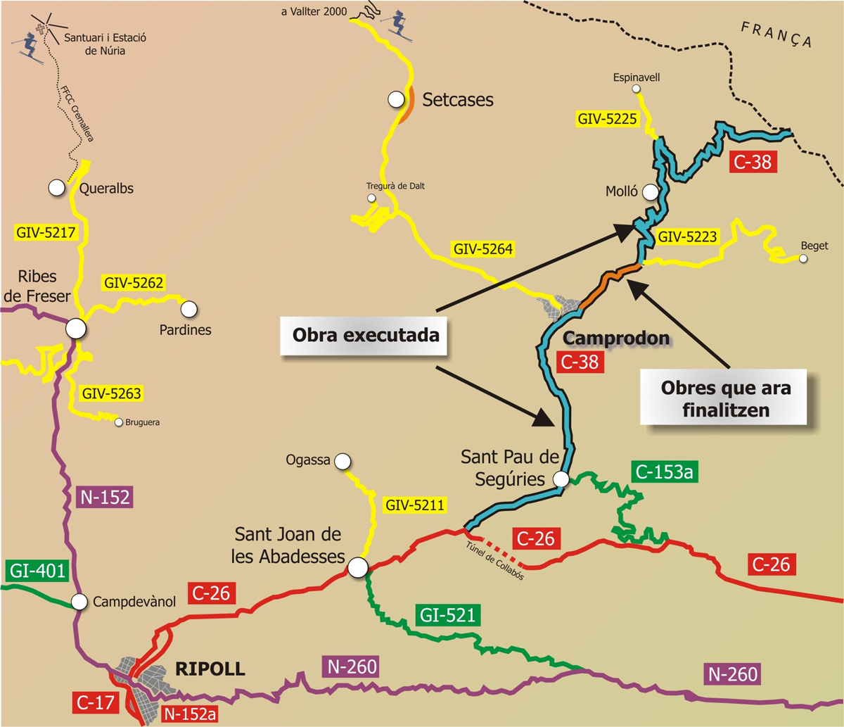 L’obra que ara ha finalitzat completa el conjunt d’actuacions que en els últims anys el DPTOP ha portat a terme per tal de millorar tot el traçat de la C-38, carretera que discorre des de l’encreuament de la C-26 (terme de Sant Joan de les Abadesses) a Camprodon i des de Camprodon a Molló i a la frontera francesa, al Coll d’Ares.