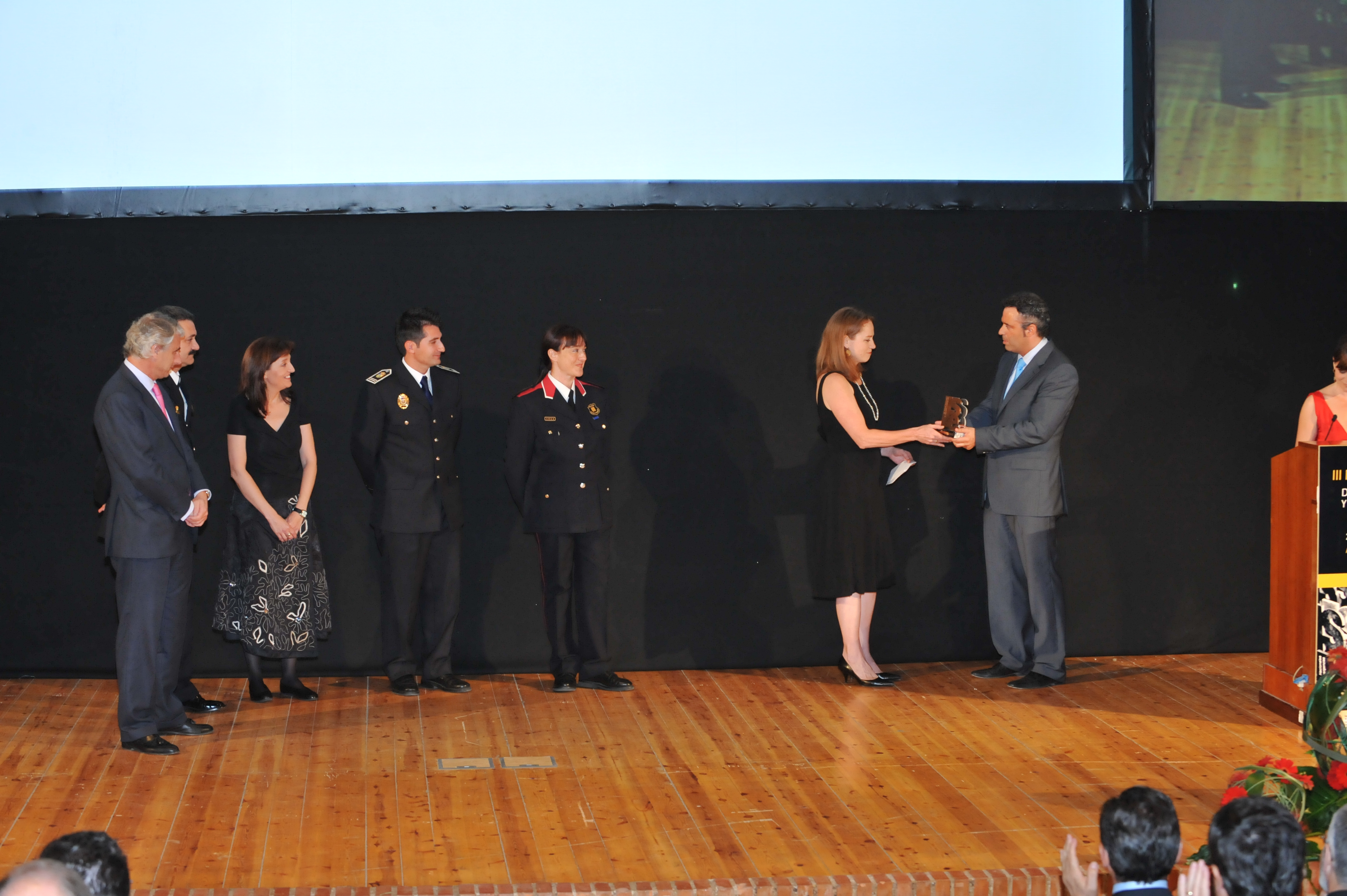 Peu de foto: “La responsable de l'Open Society Institute, Rachel Neild, recull, dijous a la nit a Saragossa, el Premi Nacional de Seguretat i Emergències a les Bones Pràctiques en la Seguretat Pública acompanyada per la inspectora Yvonne Valero, cap de l'ABP del Gironès, el cap de la policia local de Fuenlabrada, la responsable de Recerca i Relacions Internacionals de l'ISPC, Lola Vallès, el cap de la policia local de Girona, Josep Palouzié, i el director de l'Academia de la Policia Local de la Comunidad de Madrid.”