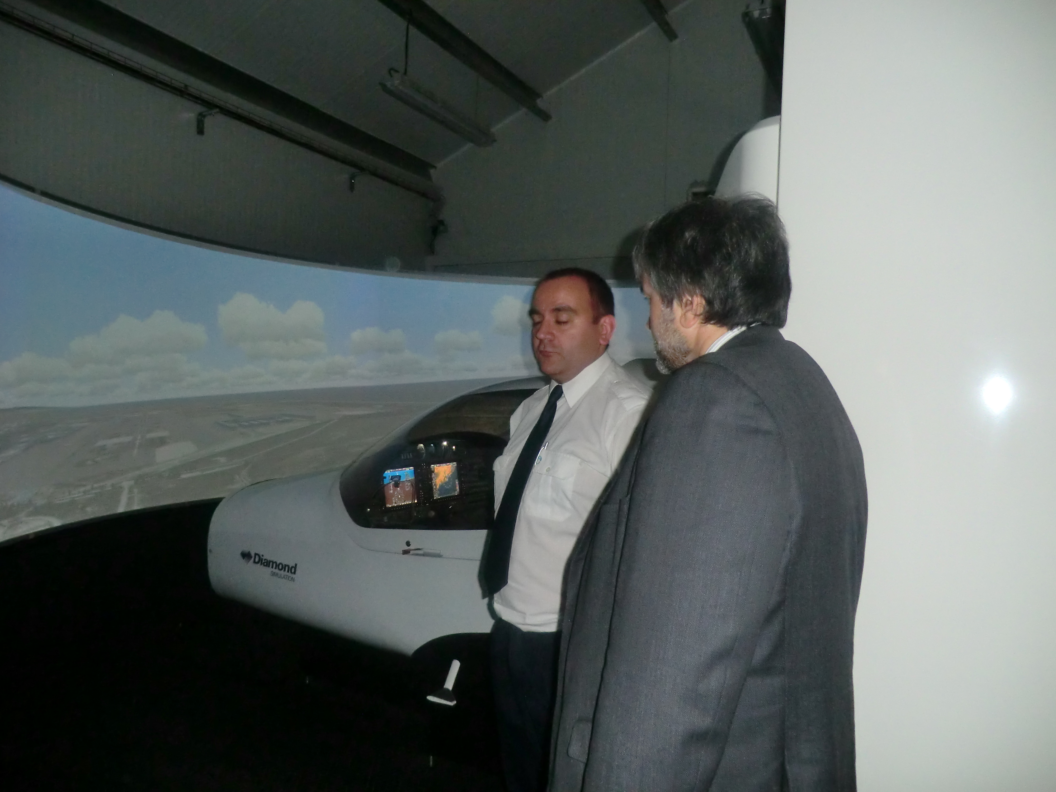 El delegat del Govern ha pogut constatar personalment les sensacions que es tenen en pilotar un avió en fer un vol simulat supervisat per l’instructor de pilots. CESDA disposa de dos simulador d’alta tecnologia. L’últim adquirit pel centre ha tingut un cost de 500.000 euros.